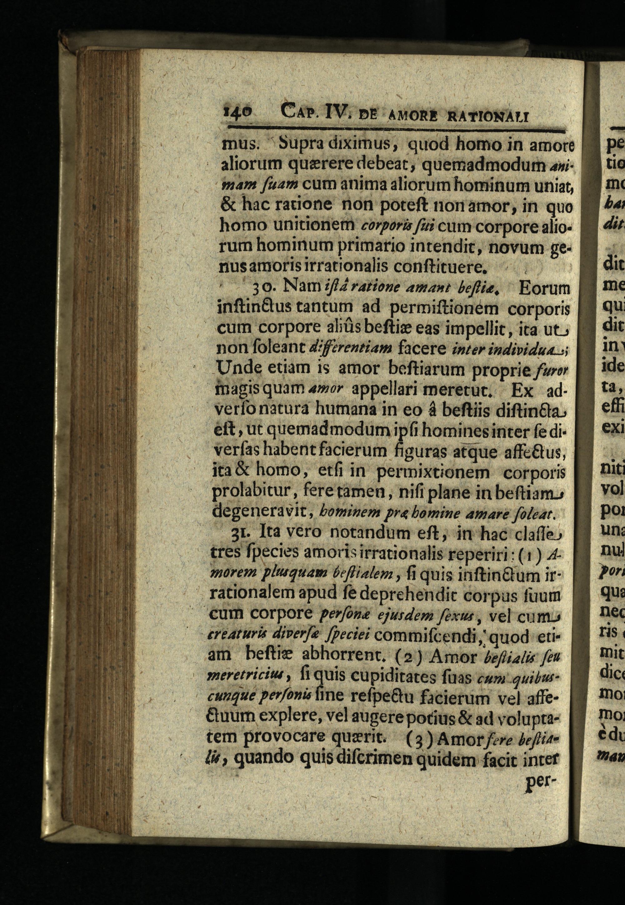 non foleant Z/fzrentiam facere inter individua Unde etiam is amor beftiarum proprie furo inagis quam 4»or appellari meretuc, Ex adverfo natura humana in eo à beftiis diftin&la; eft, ut quemad modum ipfi hominesinter fe diverfas habent facierum figuras atque affc&us, ita& homo, etfi in permixtionem corporis prolabitur, fere tamen, nifi plane in beftiam, degeneravit, Pominem pra bomine amare foleat. 3r. Ita vero notandum eft; in hac claffe) tres fpecies amorisirrationalis reperiri:(1) 4morem plusquam bcffialem, fi quis inftin&um ir: rationalem apud fe deprehendit corpus fuum €um corpore perfonz ejusdem fexus, vel cumo ereaturi diverfe Jpeciei commifcendi, quod etiam beftie abhorrent.(2) Amor /afiali fen | meretriciue, fi quis cupiditates fuas cwquibucunque perfonis bine refpe&u facierum vel affeCuum explere, vel augerepotius& ad voluptatem provocare querit.(3)Amorjere jeffiei&, quando quis difcrimen quidem facit inter per