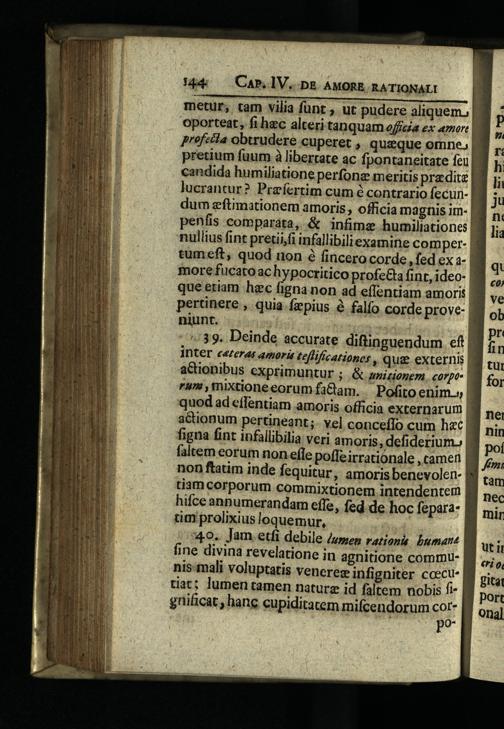 metur, tam vilia funt, ut pudere aliquem.| oporteat, fi hzc alteri tanquam offzia ex amor: t préfzila obtrudere cuperet, queque omne; H pretium fuum à libertate ac fpontaneitate feu: candida humiliatione perfonz meritis preditz p lucrantur? Przíertim cum é contrario fecun- B dum zftimationem amoris, officia magnis im- E penfis comparata,& infime humiliationes 5 nullius fint pretiijfi infallibiliexamine com per- B tumeft, quod non é fincero corde, fed ex a-| more fucato ac hypocritico profe&a fint, ideo-| que etiam hzc figna non ad effentiam amoris| pertinere, quia fepius é falfo corde prove-| niunt.:) 39. Deinde accurate diflinguendum. cft| inter cezeras avporia teflificationes, quee externis| a&ionibus exprimuntur;.& awizionem. corpo-* rim ,mixtioneeorum fa&lam.| Pofitoenim.s| quod ad effentiam amoris officia externarum| a&tionum pertineant;- yel conceflo cum hac B figna fint infallibilia veri amoris, defiderium.:, faltem eorum non efle poffeirratiónale ,tamen f non ftatim inde fequitur, amoris benevolentiam corporum commixtionem intendentem hifce anpumerandam effe, fed de hoc feparatim prolixius loquemur, URN 440. Jam etfi debile /usen rationis bumane fine divina revelatione in agnitione cómrmlnis-mali voluptatis vencreg infigniter ccecutiat; lumen tamen naturz id faltem nobis fi gnificat, hanc cupiditatem mifcendorum cor