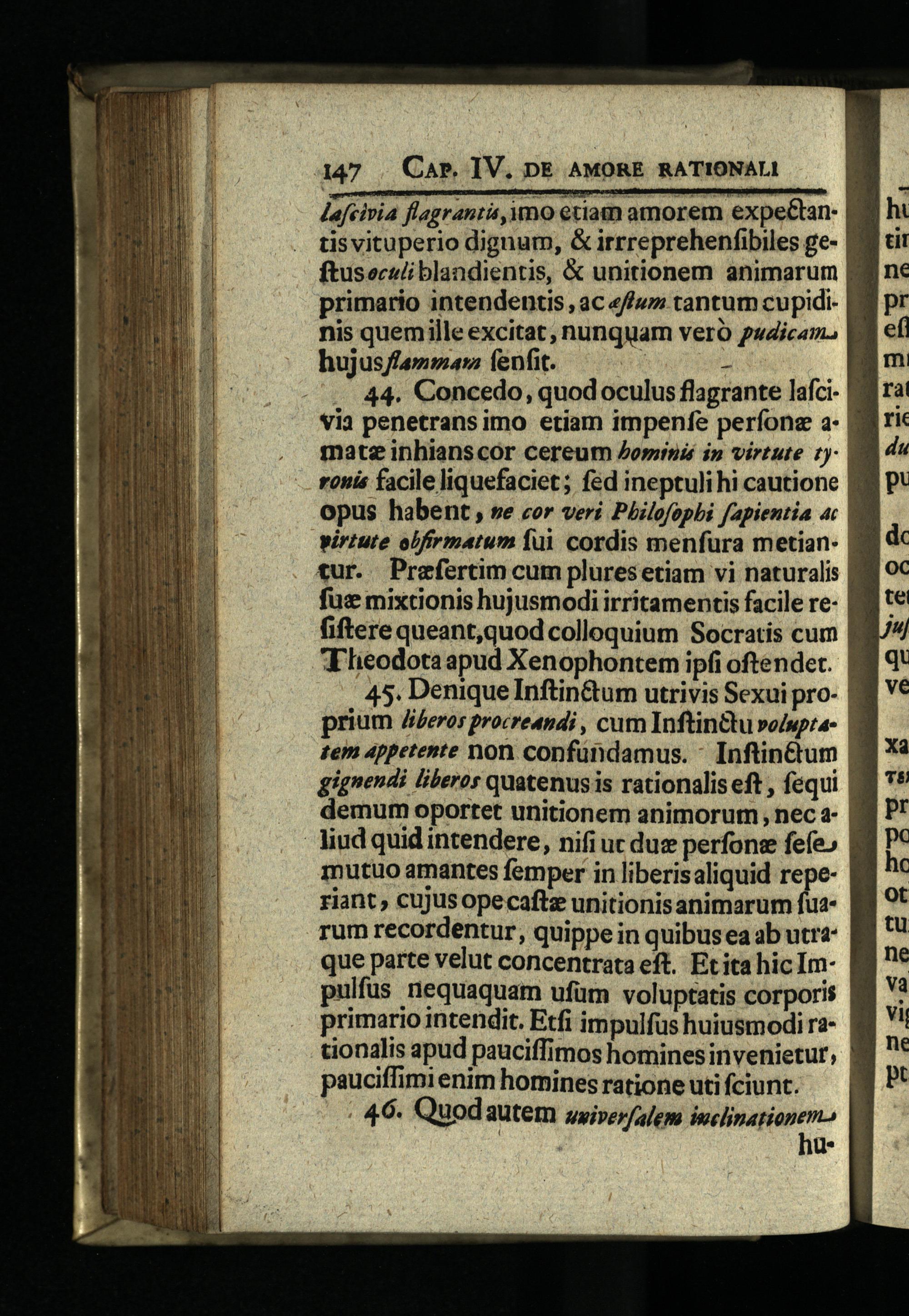 45. Denique Inftin&um utrivis Sexui pro-| prium /i£eror procreandi, cum Inftin&tu vo/upta- 7 tem 4ppetente non confündamus.- Inftin&tum gignendi liberos quatenusis rationalis eft, fequi| demum oportet unitionem animorum, nec a-| liud quid intendere, nifi uc duz perfonee fefe; mutuo amantes femper in liberisaliquid reperiant, cujus opecafte unitionis animarum fua rum recordentur, quippe in quibus ea ab utrzque parte velut concentrata eft. Et ita hic Impulfus nequaquam ufüm voluptatis corporis primario intendit. Etfi impulfus huiusmodi rationalis apud pauciffimos homines invenietur,| pauciffimienimhominesrationeutifciunt.|