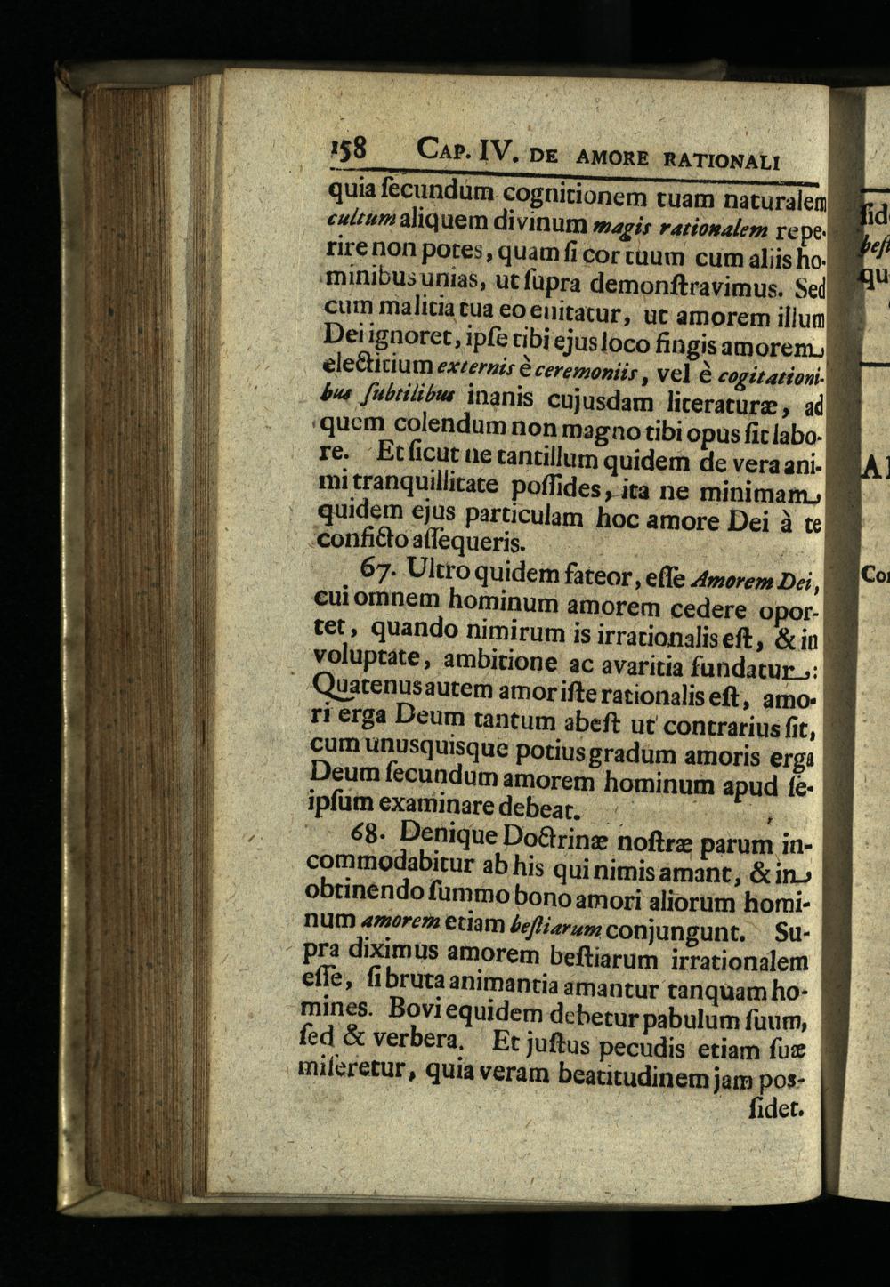 quia fecundum cognitionem tuam naturalen] euttum aliquem divinum magis rationalem reped rire non potes, quamfi cor caum cum aliis ho minibus unias, ut fupra demonftravimus. Sed^ cum malitia tua eo euitatur, ut amorem illum! Deiignoret, ipfe tibi ejusloco fingisamorem.| eledtirtium externis à ceremoniis, vel à cogitationibue fubrilibw inanis cujusdam literaturz» add 'quem colendum non magno tibi opus fit labo.| re. Etficut netantillum quidem de veraani.| mitranquillitate poffides, ita ne minimam.| quidem ejus particulam hoc amore Dei à te] :confiGo affequeris. e 67. Ultro quidem fateor, effe 4»rem Dei, b cui omnem hominum amorem cedere opor- E tet, quando nimirum is irrationalis eft;&in p voluptáte, ambitione ac avaritia fundatur.: . Quatenusautem amor ifte rationalis eft, amo:| ri erga Deum tantum abeft ut contrarius fit,| cum unusquisque potiusgradum amoris erga| Deum fecundum amorem hominum apud fe- E ipfümexaminaredebeat,^ 8] 68. Denique Do&rine noftre parum incommodabitur ab his qui nimis amant,& in.» obtinendo fümmo bono amori aliorum hominum«ore etiam£effiarup, conjungunt. Supra diximus amorem beftiarum irrationalem effe, fibruta animantia amantur tanquam homines. Boviequidem debetur pabulum fuum,| fed& verbera,/ Et juftus pecudis etiam fuz| mileretur, quia veram beatitudinem hnpos 1det.