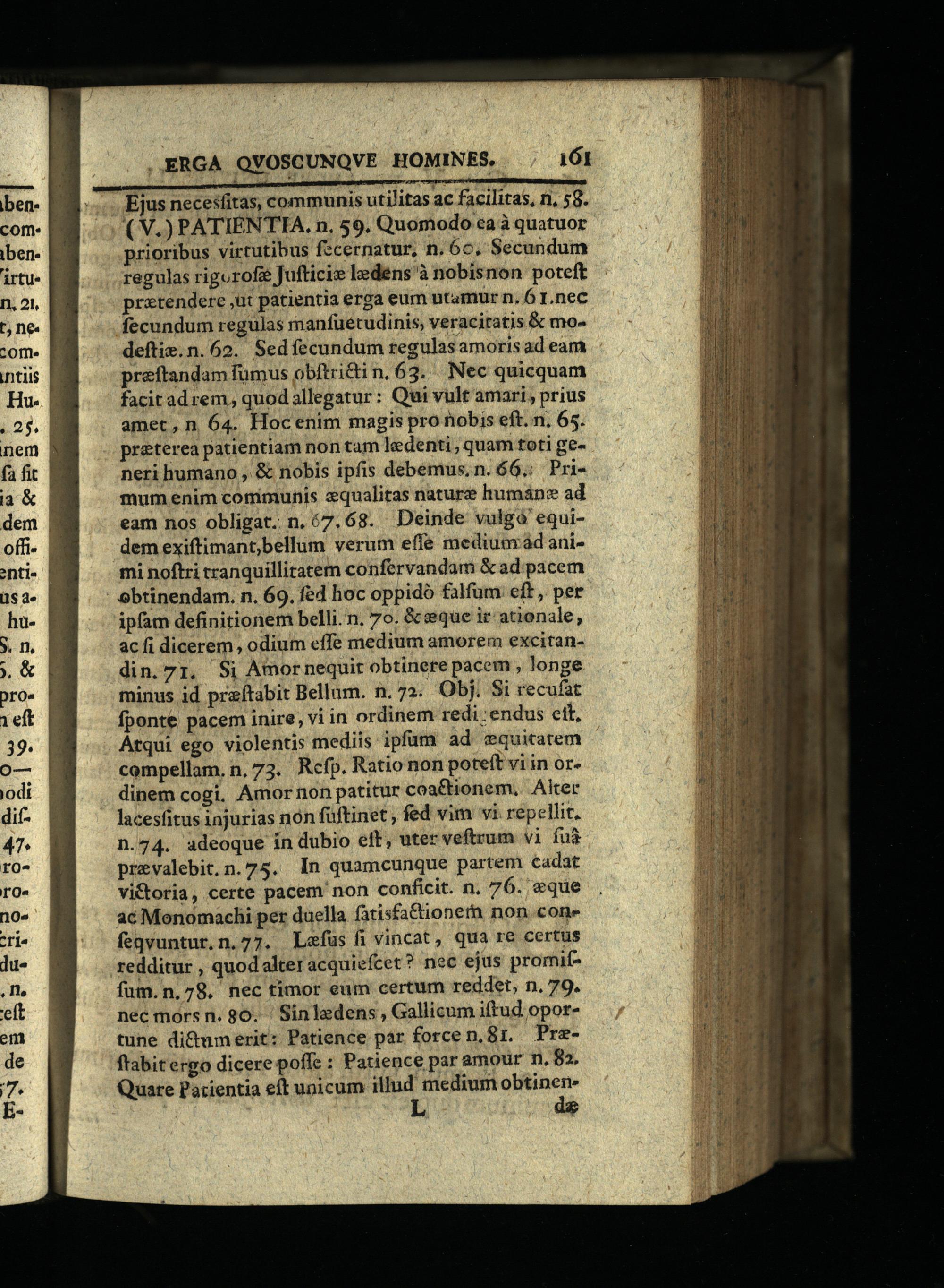 Bs i EA: DADA Ejus necesfitas, communis utilitas ac facilitas, n, 58. ( V.) PATIENTIA. n. 59. Quomodo ea à quatuor prioribus virtutibus fzcernatur, n. 6, Secundum regulas rigurofie Jufticiz ledens'à nobisnon poteft pretendere ,ut patientia erga eum utamur n, 6I.nec fecundum regulas manfuetudinis, veracitatis& modeftiz.n.62. Sedíecundum regulasamoris ad eam preftandam fumus obftridtin, 63. Nec quicquam facit ad rem, quodallegatur: Qui vult amari, prius amet, n 64. Hocenim magis pro nobis eft. n. 65. praterea patientiam non tam ledenti, quam toti generi humano,& nobis ipfis debemus.n. 66... Primum enim communis xqualitas nature humane ad eam nos obligat. n. 67.68. Deinde vulgó equidem exiftimant;bellum verum effe mediuarad animi noftri tranquillitatem confervandam&adpacem obtinendam. n. 69. fed hoc oppidó falfum: eft, per ipfam definitionem belli. n. 7o.&«eque ir ationale, ac fi dicerem, odium effe medium amorem excitandin.71,$i Amor nequir obtinere pacem, longe minus id praftabit Bellum. n. 72. Obj. Si recufat fponte pacem inire, vi in ordinem redi:endus eit, Atqui ego violentis mediis ipfum ad equitatem compellam. n, 73. Refp. Rationon poteít vi in ordinem cogi. Amornon patitur coaftionem, Alter lacesfitus injurias non füftinet fed vim vi. repellit. n.74. adeoque in dubio eft, uter veftrum vi fuà prevalebit,n.75. In quamcunque partem cadat vi&oria, certe pacem non conficit. n. 76. eque ac Monomachi per duella fatisfa&ionern non.confeqvuntur.n.77. Lefus fi vincat, qua re certus redditur, quod alter acquiefcet? nec ejus promiffum.n.78. nec timor eum certum reddet, n. 79. nec mors n. 80... Sinledens, Gallicum iftud oportune di&umerit: Patience par forcen,81. Preftabitergo dicere poffe: Patience par amour n. 82. Quare Patientia eft unicum illud medium obtinen