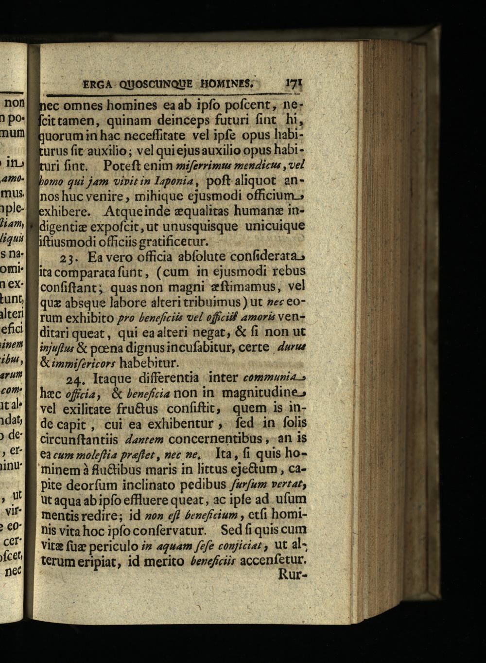 y&onmifericors habebitur. 24. Itaque differentia inter communia» hzc offcia,& beneficia non in. magnitudine vel exilitate fru&us confiftit, quem is inde capit, cui ea exhibentur ,. fed in folis circunftantiis Z4»rem concernentibus, an is ea cum moleflia praflet, nec ne, Ya, fi quis hominem à flu&tibus maris in littus eje&tum, capite deorfum inclinato pedibus furfum vertat; üt aqua ab ipfo effluere queat, ac ipfe ad ufum mentisredire; id»o» eff éeneficium, etfi homillis vitahoc ipfoconfervatur. Sedíiquiscum Vire(üz periculo i» aquam fefe coujiciaz, ut alterumeripiat, id merito /eroficir Keenfethr, NUr