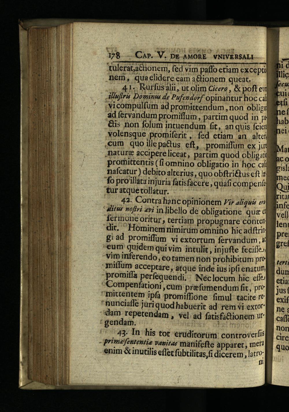 178— Car. V. DE AMORE VNIVERSALI tülerataGtionem, fed vim paffo etiam exceptip nem, qua elidere eam a&tionem queat. A41. kurfusali, ut olim Cicere,& poft eu Miufiris Dominus de Pufendorf opinantur hoc cáfj . vicompulfüm ad promittendum, non oblig: ad fervandum promiffum, partim quod in psg &is non folum intuendum fit, an quis fci volensque promiferit, fed etiam an alte cum quoillepa&us eft, promiffum ex jui nature accipere liceat, partim quod obliga promittentis(fi omnino obligatio in hoc c:
