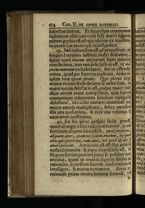 .,20. Ex his igitur perfpici facile. poteft, quod nil magis à faná ratione abhorreat, quam hominem aliquem ideó odiíle, qwoZ perfonam aliquam amet, quam nos itidem amanus, pel quo alius quis prater nos, eam amet y vel quod ab alio Je amaripatiatur... Amor.non eft effcQus arbiu!l noftrifednature:& eque impoffibile eft, tt Magnesferrum proxime juxta fe pofitum non attrahat, quam ut mentes ingenio fimiles 2t rationales, fi cordium fuorum conformitate intelligant, femutuo nonament.|. Amor ifrationalis primo intuitu hominis formofi; B