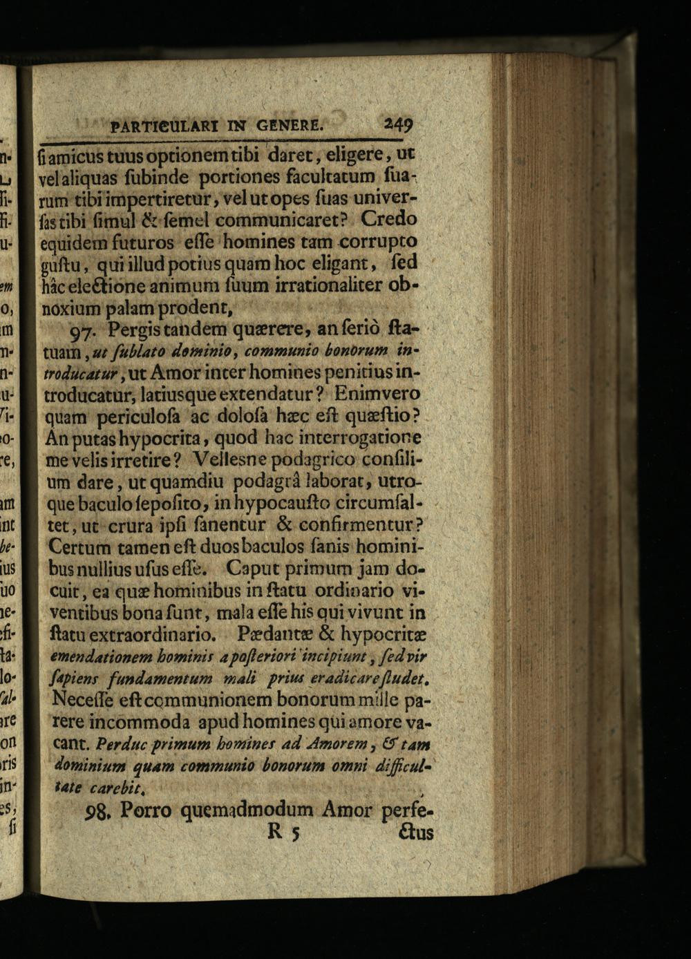 97. Pergistandem querere, anferió ftatuam ,uz fublato dominio, communio bonorum introducarur, ut Amor inter homines penitius introducatur, latiusque extendatur?: Enimvero quam periculofa ac dolofa hzc eft quzftio? An putas hypocrita, quod hac interrogatione me velisirretire? Vellesne podagrico confilium dare, ut quamdiu podag:à laborat; utroque baculofepofito, in hypocaufto circumfaltet, ut: crüra ipfi fanentur& confirmentur? Certum tamen eft duosbaculos fanis hominibus nullius ufuseffe.| Caput primum jam docuit, ea quz hominibus in ftatu. ordipario viventibus bona funt, mala effe his qui vivunt in flatuextraordinario. Paedantee& hypocrite emendationem bominis a pa[leriort incipiunt, fed vir fapiens: fundamentum ali. prius eradicarefludet, Nece(fe eft communionem bonorum mille parere incommoda apud homines qui amore vacant. Perduc primum bomines ad Amorem,€ tam dominium quam communio bonorum omni difficuliate carebit, í
