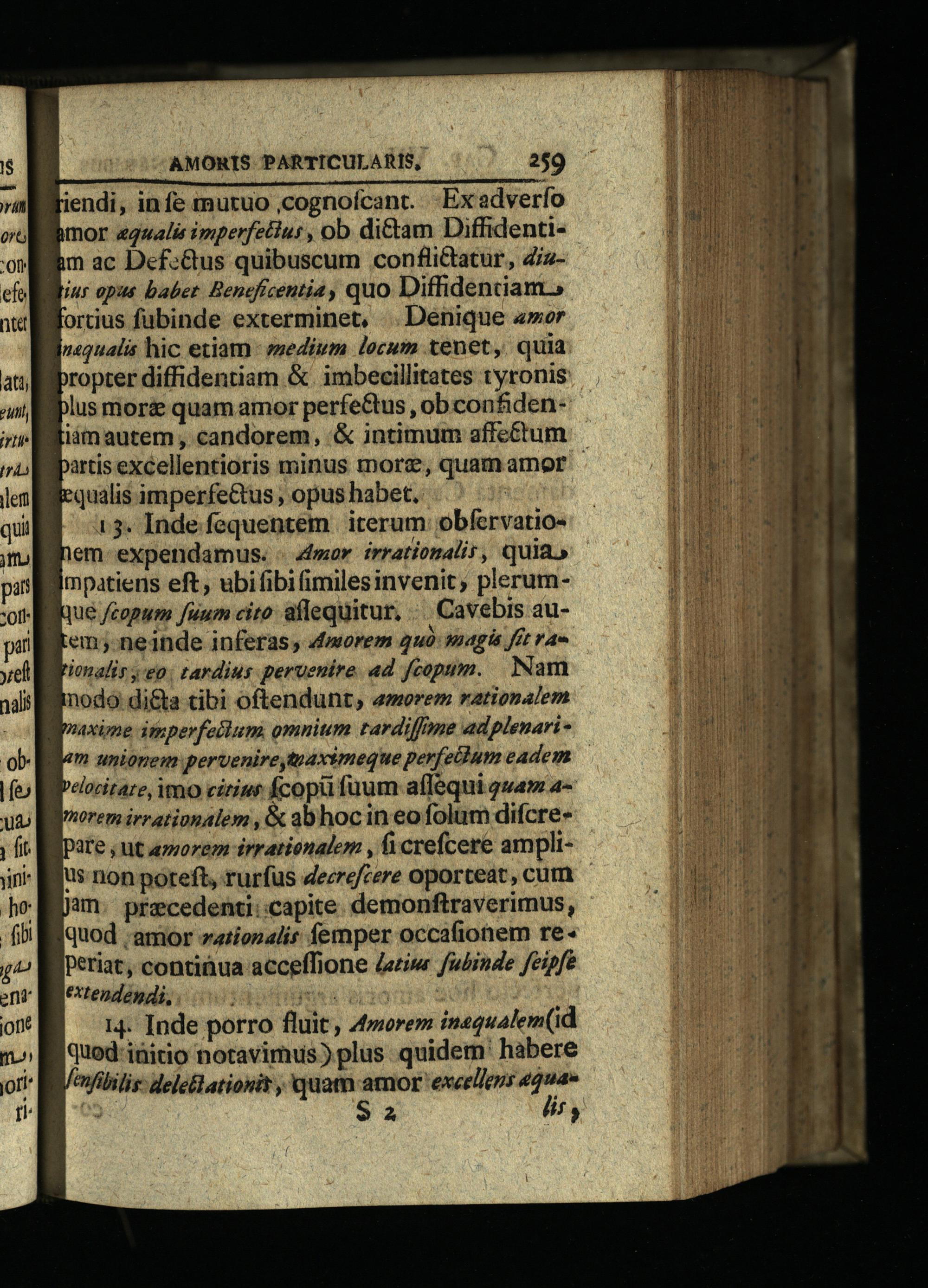 iendi, in fe mutuo ,cognofcant. Ex adverfo imor ali imperfetius, ob di&tam Diffidentiim ac DefsQus quibuscum conflictatur, Ziagriur opus babet. Beneficentia, quo Diffidentiam., ortius fubinde exterminet,. Denique«wor nequalis hic eciam- sedium locum xenet,. quia bropter diffidentiam&. imbecillitates tyronis blus morie quam amor perfe&us, ob confidenfiámautem, candorem,.& intimum affe&tum bartis excellentioris minus more, quam amor equalis imperfectus, opus habet. 13. Inde.fequentem| iterum: obfervatioem-expendamus.« zimor irrationalir, quia.» ümpatiens eft, ubifibifimilesinvenit, plerumue fcapum fuum cito aflequitur,. Cavebis auem;.neinde inferas, dmorem 2uà: magts fft rav rionalir y eo. rardius peruenire. ad fcopum. Nam nodo di&a tibi oftendunt,«morem rationalem maxime imperfellum omnium tardiffme adplenari«m unionem pervenire teaximeque perfelum eadem velocitate, mo citimr fcopu fuum affequi quam amoremirrationalem,& abhocin eo folum difcreare, ut azorem irrarionalem, ficrefcere amplius non poreft, rurfus decrefcere oporteat, cum am. precedenti::capite demonftraverimus, quod:amor zationalir femper occafionem re. Periat, continua acceffione Zee fubinde feipfe extendendi, Pape a 14. Inde porro fluit, 4»orem insqualem(id quod:iüitio notavimus) plus quidem: habere onfibilis: deleflationit, quat amor" excellens—