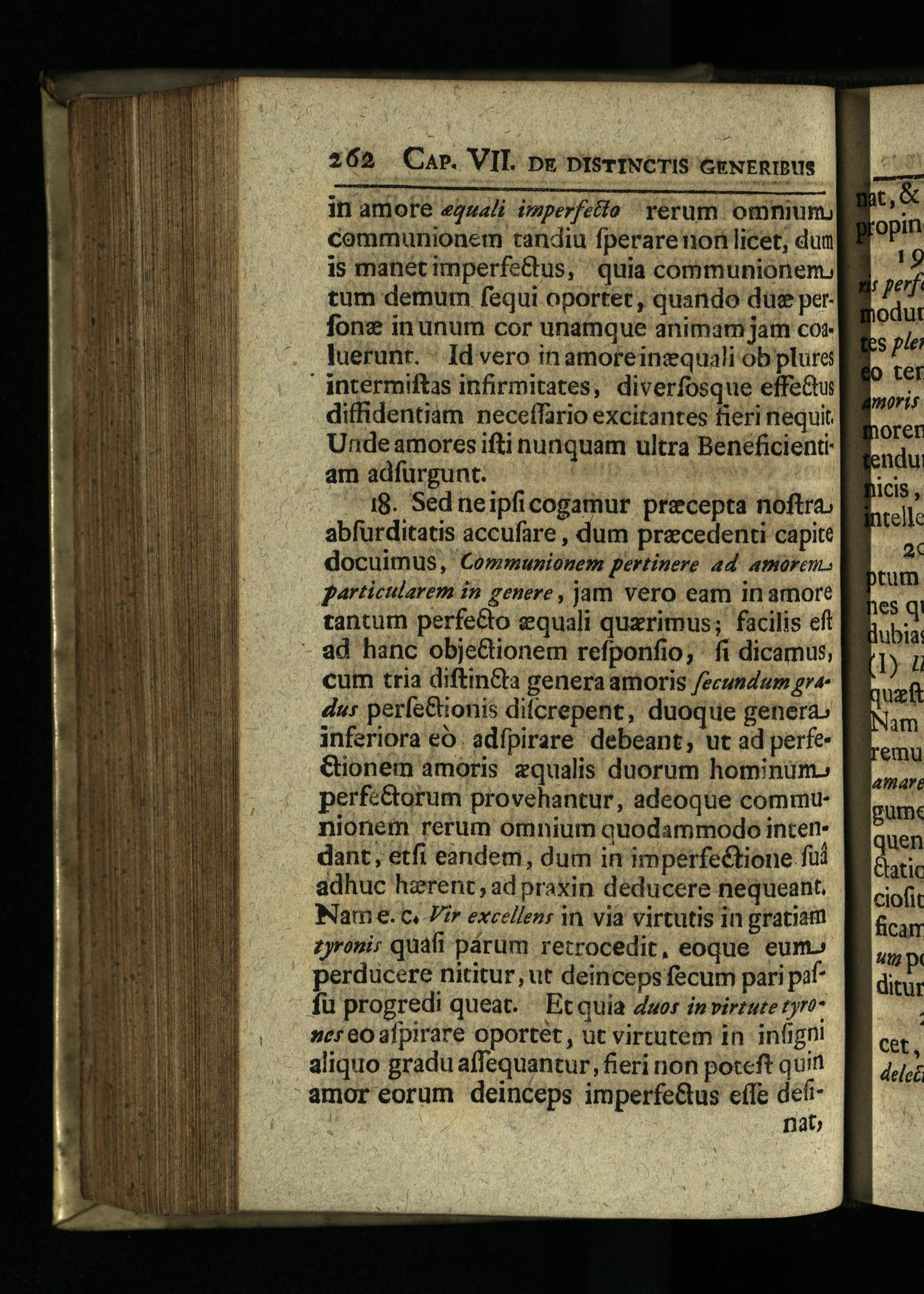 18. Sed neipficogamur precepta noftra; abfurditatis accufare, dum precedenti capite docuimus, Communionem pertinere ad: amarem particularem in genere, jam vero eam inamore tantum perfecto equali quzrimus; facilis eft - ad hanc objeGionem refponfio; fi dicamus, cum tria diftin&ta genera amoris fecundum gradus perfe&ionis difcrepent, duoque genera inferiora eo. adfpirare debeant; ut ad perfe Gionem amoris equalis duorum hominum perfé&orum provehantur, adeoque communionem rerum omnium quodammodo intendant, etfi eandem, dum in imperfeétione ful adhuc herent, adpraxin deducere nequeant. Nam e. c, Vir excellens in via virtutis in gratiam zyronis quafi párum retrocedit, eoque eum» perducere nititur, ut deinceps fecum pari pi fu progredi queat. K Et quia 4uor in virzute tyrtner eo afpirare oportet, ut virtutem in infigni aliquo gradu affequantur, fieri non poteft quit