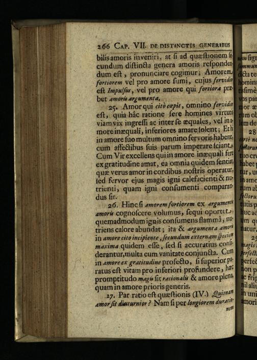 2$. Amor qui cité capit, omnino fervidi eft, quia hác ratione. fere homines virtu viam vix ingreffi ac interfe equales, vel ine moreanequali, inferiores amare folent; Echi inamore füo multum omnino fervoris habent cum affe&ibus fuis: parum imperare ícianta Cum Vir excellens quiin amore inz:quali fer ex gratitudine amat, éa omnia quidem fentit quiz verusamor in cordibus noftris operatul, fed fervor ejus magis igni calefacienti& nv trienti; quam igni. confumenti, compara? dus fir. 726. Hincfi amorem fortiorem ex argument amoris cognofcere volumus, fequi oportet»: quemadmodum ignis confumens flammà, n triens caloreabundat; ita G argumenra muri in amore cito incipiente, Jeeundum externam peciit maxima quidem effe, fed fi accuratius con derantur,multa cum vanitate conjun&a. Cur? in amore ex gratitudine profe&o, fi fuperior p* ratus eft vitam pro inferiori profundere, hf promptitudo»agi fit rarionalu& amore plene quam in amore prioris generis.