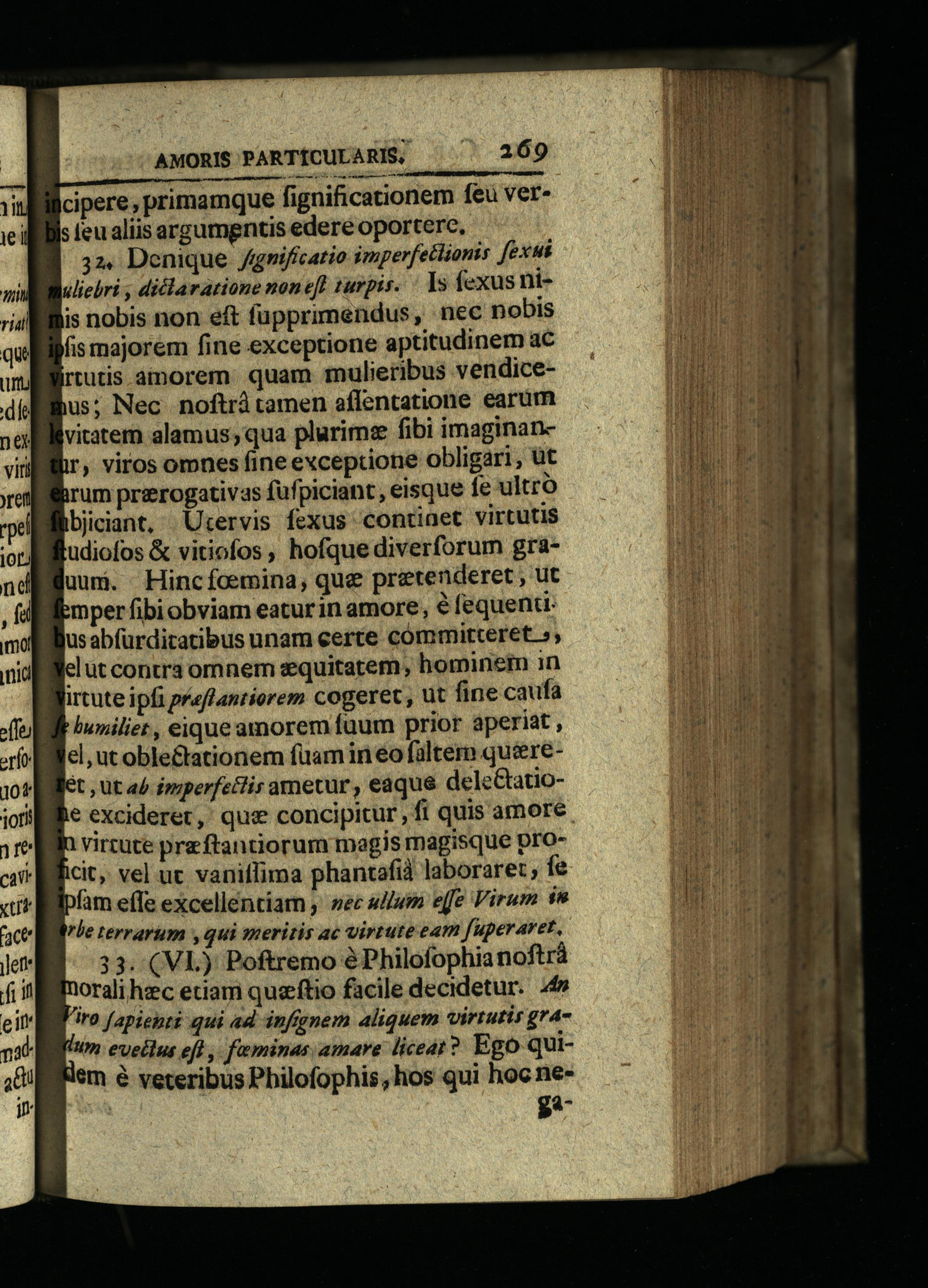 cipere, primamque fignificationem feu ver» s leualiis argumentis edere oportere. 32. Denique Jgrifícatio imperfetlionis fexus Buliciri; diclaratione non eft turpis.: Is fexusniis nobis non eft fupprimendus, nec nobis fismajorem fine exceptione aptitudinem ac rtutis ámorem quam mulieribus vendiceius; Nec noftrtamen affentatione earum vitatem alamus;qua plurimze fibi imaginanir, viros omnes fine exceptione obligari, üt irum prirogativas fufpiciant, eisque fe ultro lbjiciant,|Utervis fexus contiaet virtutis udiofos& vitiofos, hofque diverforum grauum. Hincfoemina, que pretenderet, ut imper fibi obviam eatur in amore, e fequenti: us abfürdicatibus unam certe committeret»; elut contra omnem sequitatem, hominem in irtute ipfi preflantiorem cogeret, ut fine caufa :Iuvliet, eique amorem fuum prior aperiat, el, ut oble&tationem fuam ino filter qu&reet, üt aJ immperfetlis ametur, eaque dele&tatiole excideret, que concipitur, fi quis amore. virtute preftantiorum magis magisque proicit, vel uc vaniflima phantafil laboraret, fe pam effe excellentiam ,'»ec uum effe Virum i» rle terrarum qui meritis ac virtute eam fuperavet, 33.(VL) Poftremo éPhilofophia noftrá orali hzc etiam queftio facile decidetur. 44» iro fapienti qui ad inffgnem aliquem virtutis gr4wm: evetlus eft, feminas amare liceat? Ego quilem e veteribus Pbilofophis, hos qui hoc ne» gi