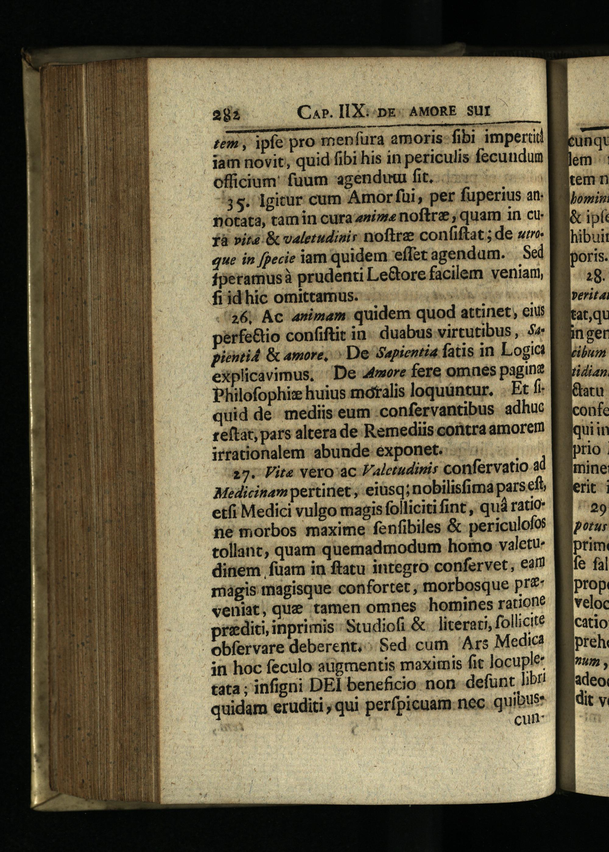 285 Cap. IIX::pg: AMORE. SUI tem, ipfe pro menfura amoris: fibi imperti jam novit, quid fibi his in periculis fecundum officium fuum«genduu fit...| 35. Igitur cum Amorfui, per fuperius an: notata, tamin cura sie noftre;quam in cu fà vita& valetudinir nofteze confiftat; de wire. que in fpecie iam quidem effet agendam. Sed fperamusà prudenti Le&ore facilem veniani, fiidhic omittamus. NN "a6, Ac animam. quidem quod attinet, eius pérfe&io confiftit in. duabus virtutibus ,.$4 pientid& amore,^ De: Sapientia fatis in Logic explicavimus."De amore fere omnes paginz Philofophi huius mótalis loquuntur.. Et fi, quid de. mediis eum.confervantibus adhuc reftat; pars altera de Remediis coritra amorem irtationalem abunde exponet.: