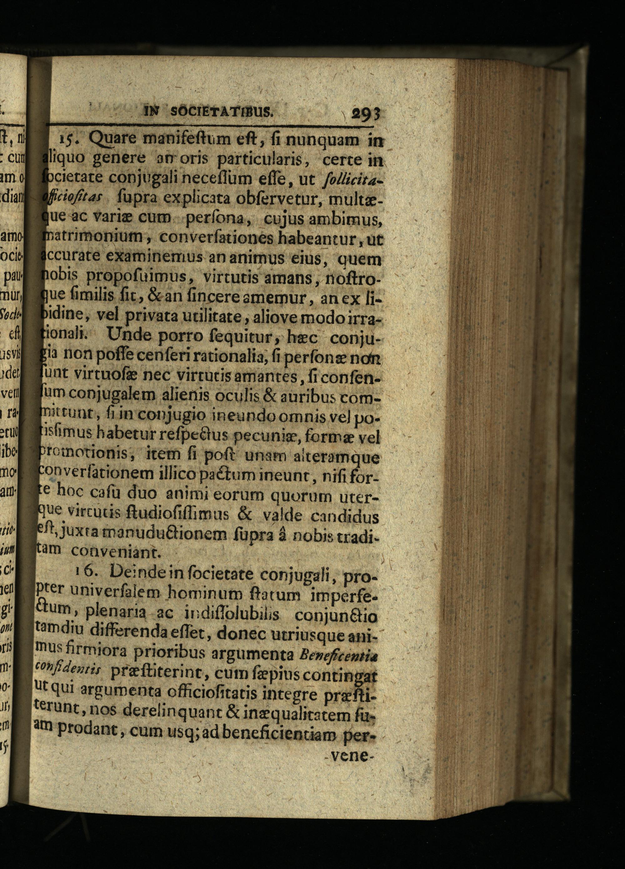 ^v sÓCiÉTATIBUS. 293 15. Quare manifeftum eft, fi nunquam in iquo genere otroris particularis, certe in bcierate copjugali neceflum effe, ut /o/liciraficiofitar. fupra explicata obfervetur, multzue-ac Varig cum. perfona, cujus ambimus, nitrimonium, converfationes habeantur, ut ccurate examinemus an animus eius, quem obis propofuimus, virtutis amans, rioftrojue fimilis fic,&an fincere smemur, an ex liIpidine, vel privata utilitate, aliove modoirraionali. Unde porro fequitur, hec conjuria non poffe cenferi rationalia; fi perfons noi unt virtuofe nec virtutis amantes, fi confenum copjugalem alienis oculis& auribus comWinitrunt, fiin copjugio ineundo omnis vel poMfisfimus habetur refpe&us pecunie, forma vel romotionis; item fi poft unsm alteramque onverfationem illico pa£tum ineunt, nifi for3£c hoc cafu duo animi eorum quorum uterque vircutis ftudiofifimus& valde candidus */., juxta manudu&lionem füpra à nobis tradiam conveniant. ; 16. Deindein focietate conjugali, proiter univerfalem hominum ftatum imperfedtum, plenaria-ac indiffolubiis conjun&ia tamdiu differenda effet, donec utriusque animus firmiora prioribus argumenta Beneffcentia vonfidentis preeftiterint, cum fiepius contingat üt qui argumenta officiofitatis integre przftiterunt, nos derelinquant& inzqualitstem füàn prodant, cum usq; ad beneficientiam per-vene