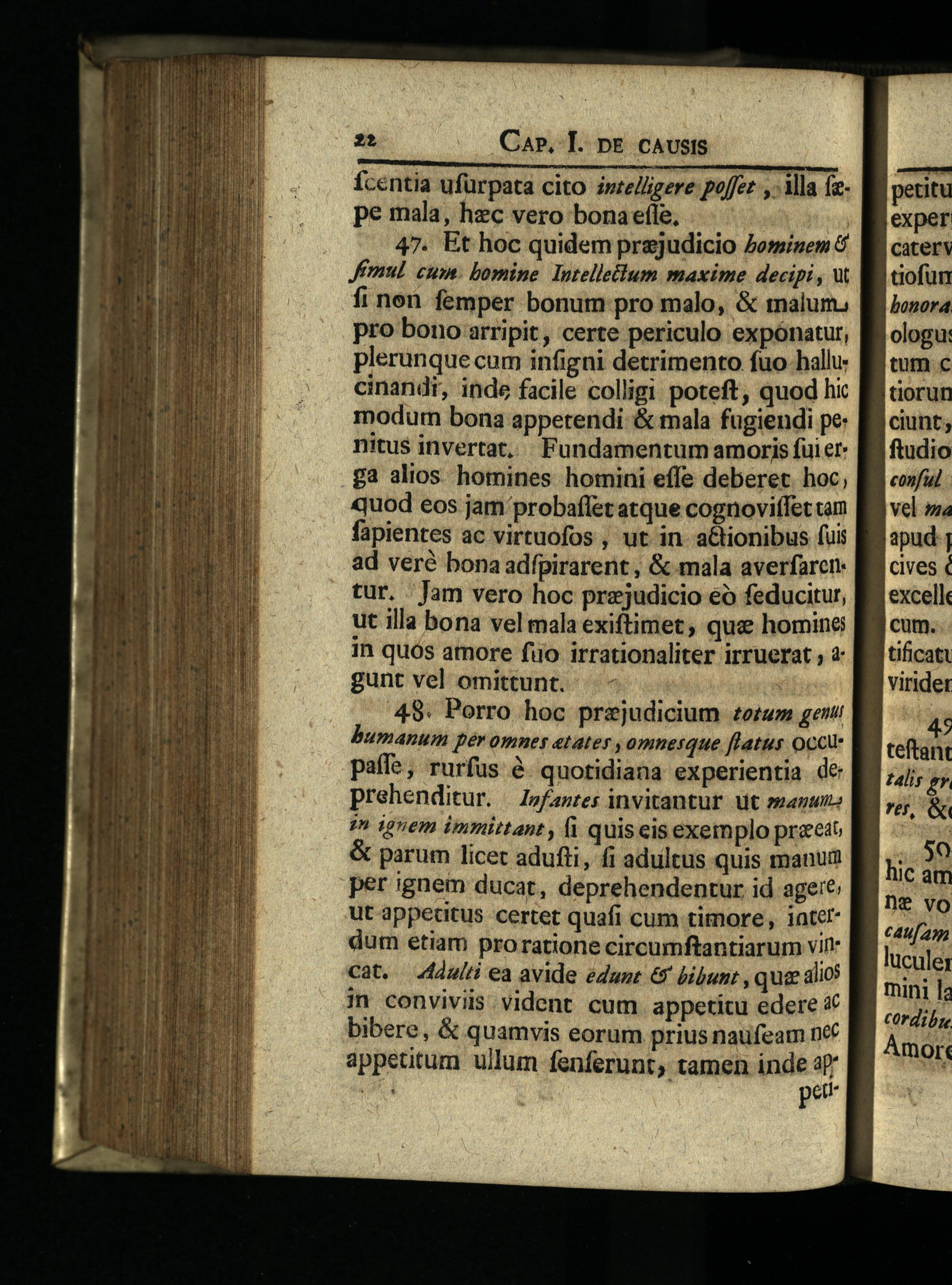 pe mala, hzc vero bonaefle, 47. Et hoc quidem prajudicio bominem& Jmul. cum. bomine Intelletlum maxime decipi, ut fi non. femper bonum pro malo,& malum, pro bono arripit, certe periculo expónatur, plerunque cum infigni detrimento fuo-hallu. cinandi, inde facile colligi poteft, quod hic modum bona appetendi& mala fugiendi pe: nitus invertat, Fundamentum amoris fui er: ga alios homines homini effe deberet. hoc, quod eos jam probaflet atque cognoviffet tam fapientes ac virtuofos, ut in ationibus fuis ad veré bona adfpirarent,& mala averfarcr tur. Jam vero hoc przjudicio à feducitur, ut illa bona vel mala exiftimet, que homine in quós amore fio irrationaliter irruerat, t guntvel omittunt...-—— 48. Porro hoc prejudicium orum geni umanum per omnes etater, omnesque flatus. OCCu-. paffe, rurfus à quotidiana experientia dé prehenditur.| Z»fawres invitantur. ut san in ignem immittant, fi quis eis exemplo praeib & parum licet adufti, fi adultus quis manum per ignem ducat, deprehendentur id agere ut appetitus certet quafi cum timore, interdum etiam pro ratione circumftantiarum vil cat. 4dulii ea avide edune& bibunt, quee dli in conviviis vident cum. appetitu edere bibere,& quamvis eorum prius naufeam n& appetitum ullum fenferunt, tamen is T