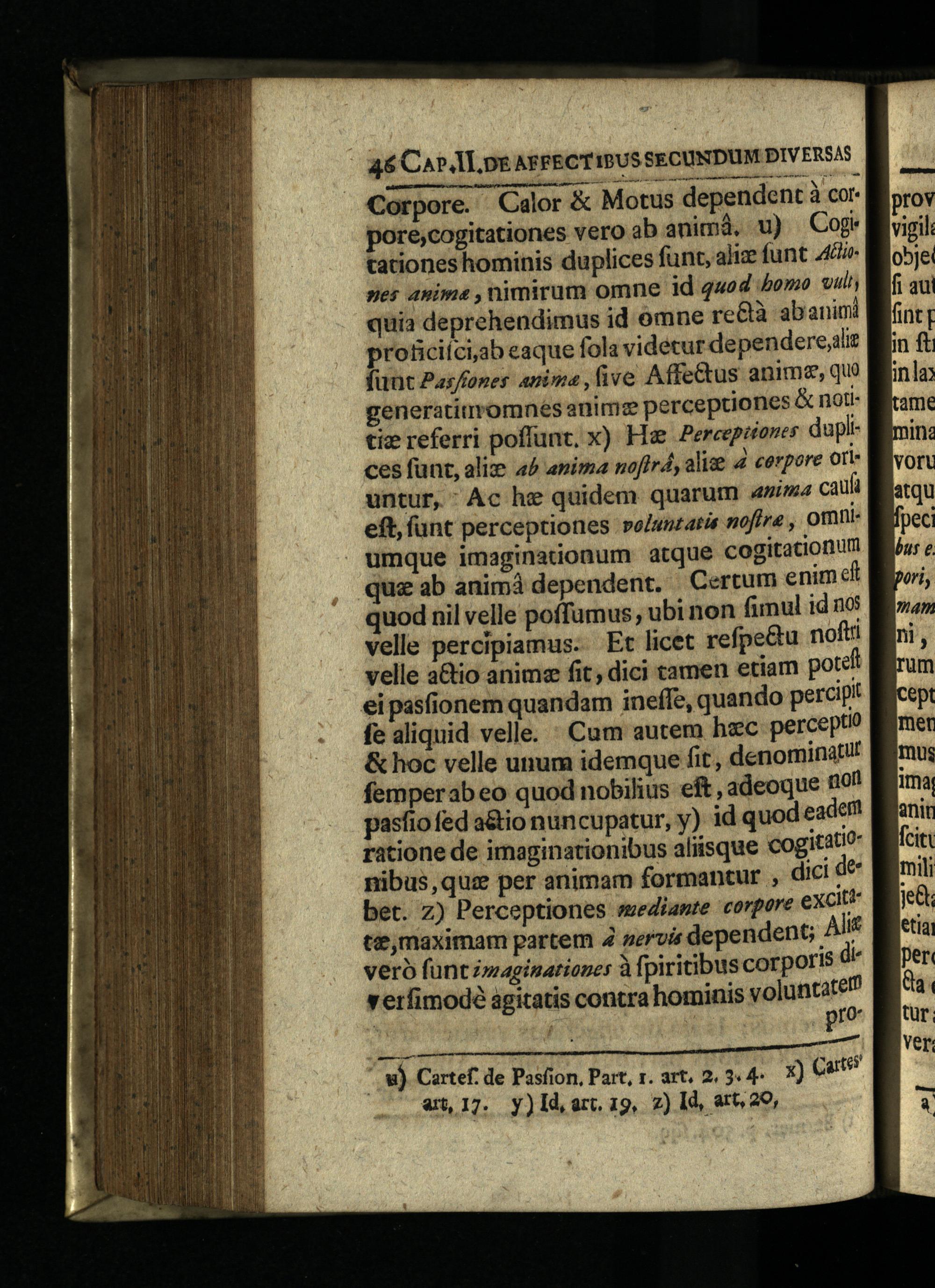 cilc odo siae loi cu M Corpore. Calor& Motus dependent à cor. pore;cogitationes vero ab animá, u) Cogr tationes hominis duplices funt, alie funt 44/0 ses anima, nimirum omne id quod bomo vully quia deprehendimus id omne re&à abanimi proficiiciab eaque fola videtur dependere,ilie funt Pas/fones anima, five Affe&tus anime, quà generatinromnes anime perceptiones& notitie referri poffunt, x) Ha Perceptiones dupli ces funt, alix 45 anima nofirá, alise 4 corpore ott untur,"Ac he quidem quarum amim4 cauli eft, fant perceptiones velunzatis nofira, omniumque imaginadionum atque cogitationum quz ab anim dependent. Certum enim ct