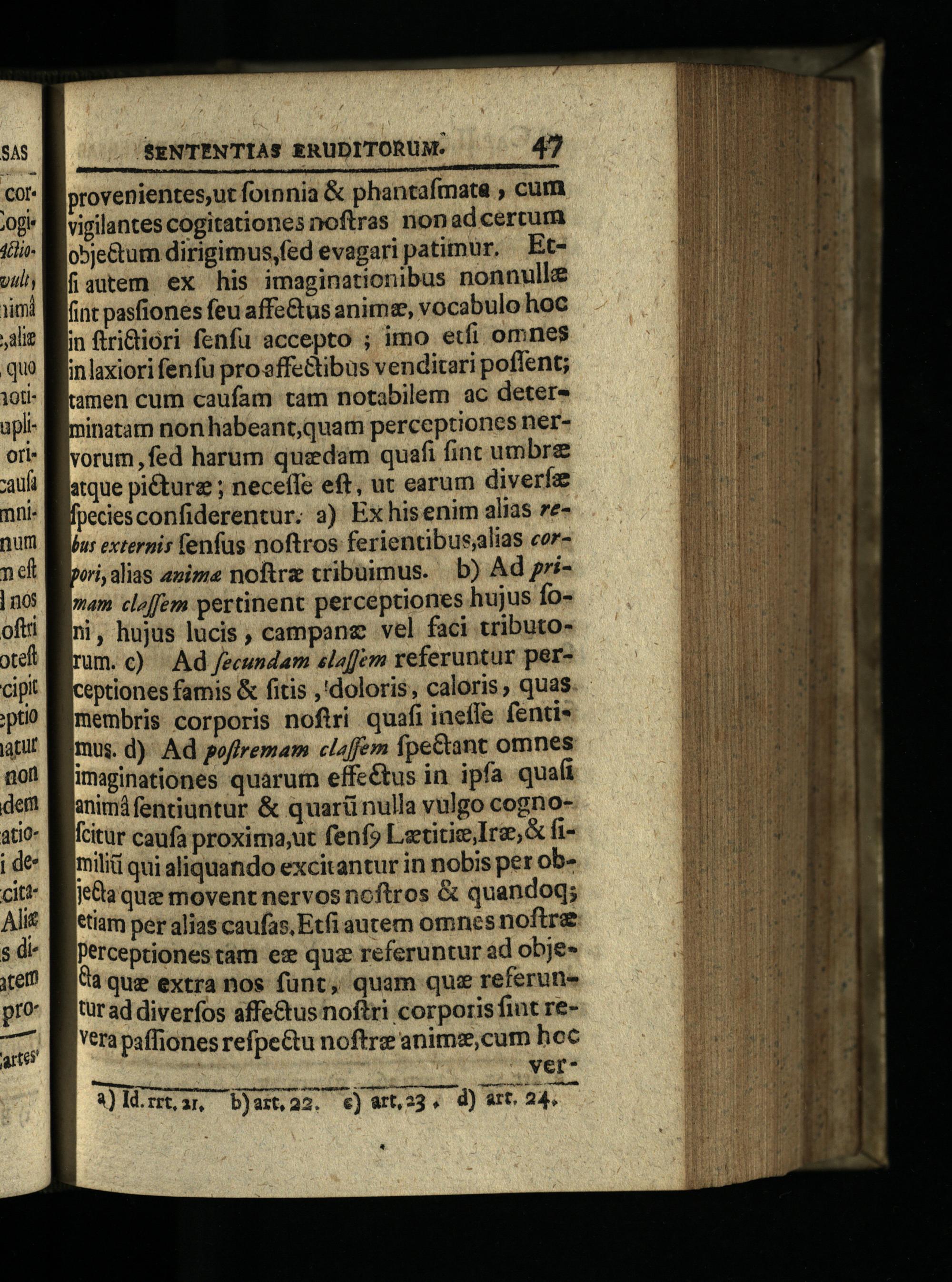 Nulli i ioris m i SOC LAM RM, provenientes,ut foinnia& phantafmate, cum vigilantes cogitationes noftras non adcercum o5je&um dirigimus,fed evagari patimur, Etfiaxem ex his imaginationibus nonnulle fint pasfiones feu affe&us anime, vocabulo hoc in ftri&tiori fenfu accepto; imo etfi omnes inlaxiori fenfu proffe&tibus vendicari poffent; tamen cum caufam tam notabilem ac detere ninatam non habeant,quam perceptiones nervorum, fed harum quidam quafi fint umbrz atque piéture; necefle eft, ut earum diverfze fpeciesconfiderentur. a) Ex his enim alias zebus externis fenfus noftros ferientibuslias corpori; alias anime noftre cribuimus. b) Ad pri"am cloffem pertinent perceptiones hujus foni, hujus lucis, campane vel faci tributoum.c) Ad J/ecundam sla[Jem referuntur peréptiones famis& fitis ,'doloris, caloris, quas membris corporis noftri quafi ineffe fentis mus. d) Ad poffremam cl4fem fpe&ant omnes Imaginationes quarum effeétus in ipfa quafi snimdfentiuntur& quarü nulla vulgo cognofcitur caufa proxima,ut fenf» Letitie, Ire, fimilii qui aliquando excitantur in nobis per obilaque movent nervos noftros& quandoq; etiam per alias caufas, Etfi autem omnes noftre erceptiones tam ez quz referuntur ad obje