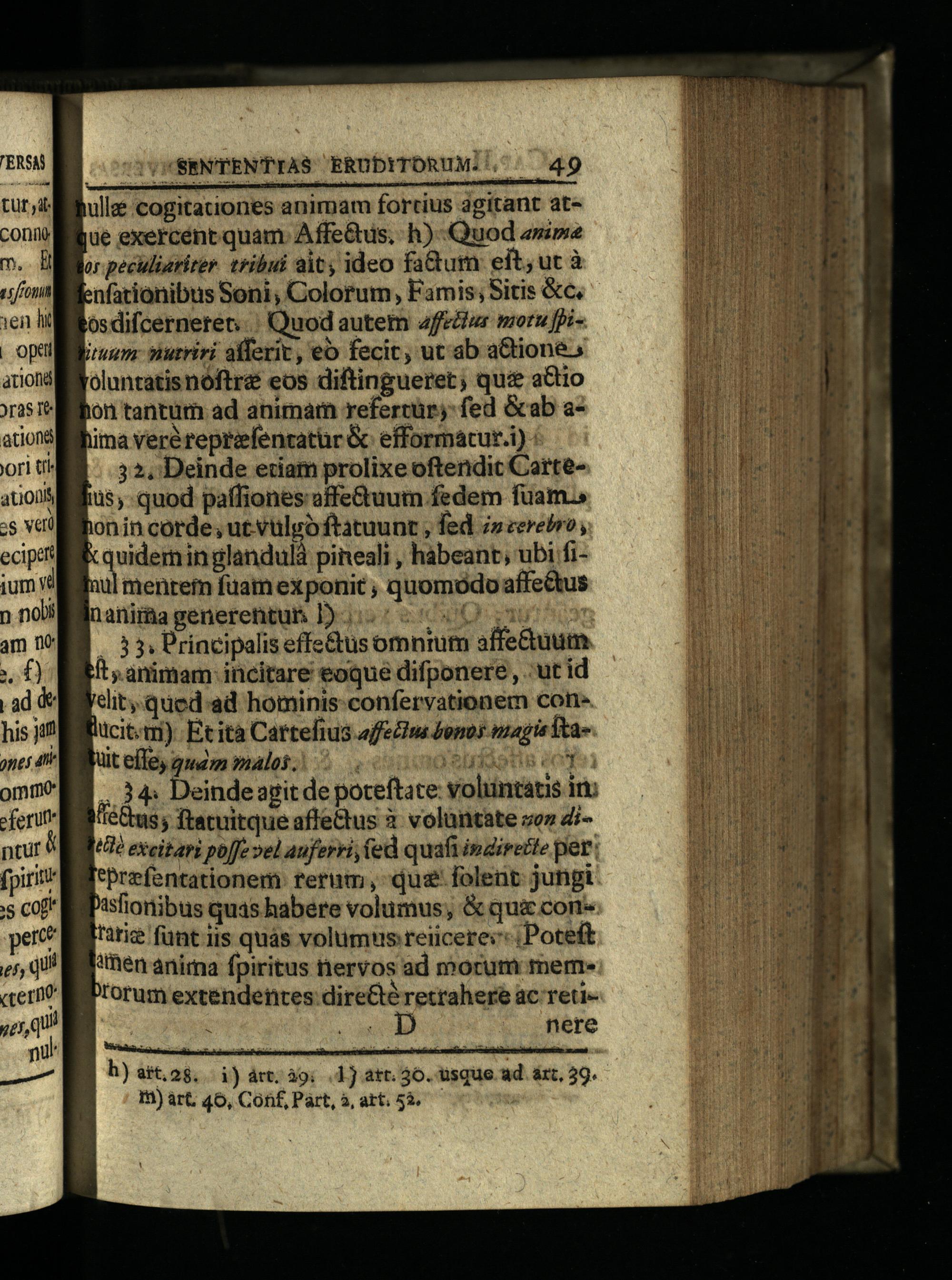OTTV SENTENTIAS ERUDITORUM: /,^ bulle cogitationes animam fortius agitant atjue exercént quam. Affe&us, h) Quod esie r peculiariter. tribui ait ideo fa&um eit, ut à enfarionibus Soni, Colorum, Famis; Sitis&c. ósdifcernereo.| Quod autem«fitus motu fpi-. uum: nurriri afleriv, eo fecic, ut.ab a&iones oluntatisnoftra eos diftingueret; qui a&io jon tantum ad animam refertur) fed&ab aima veréreprafencatur& efformacur.i): 32, Deinde etiam prolixe oftendic Carteiu5, quod paffiones sffe&uum fedem fuam.» onin corde, ut vulgo ftatuunr, fed i»zerebro; uider in glandulà pineali, hábeant, ubi fimenter füam exponit, quomodo affe&tus Dania generettub D) 4:550 i00 .. 33» Principalis effe&tus omnrum affe&uum. /, animam incitare eoque difponere, ut id dity.qued-ad hominis: confervationem con» lucit:m) Et ità Cattefius-affezina Jones magia tas ült elle) 4mm»salos.!..|euidonn coq ..34: Deindeagit de poteftate: volüntats ito fé&us; ftatuitque affectus à voluntate sez 4jtHé excitant poffe vel auferri,(ed quafi indirecte per: *Prefentationem: terum, quz folent jungi isfioribus quas habere volumus;& qui con tari funt iis quas volumus reiceres«Poteft ten anima fpiritus tiervos ad morum mem»