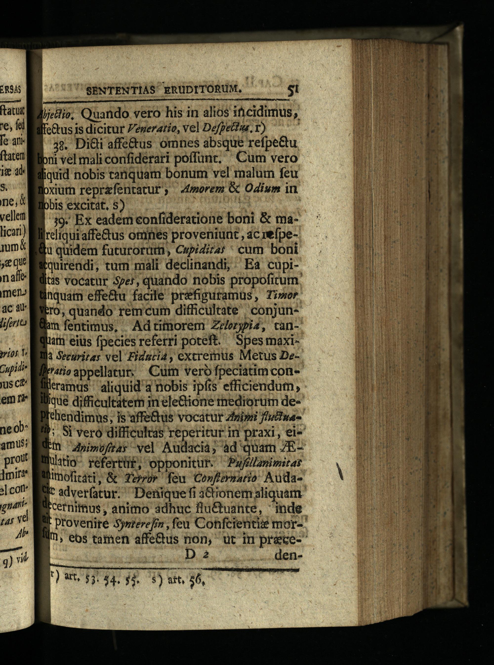 senem———— MÓMM— ljelio, Quando vero his in alios ificidimus, feCtus is dicitur Peneratio, vel Defpettus, 1) 3$. Di&ti affe&us omnes absque refpe&tu bni vel mali confiderari poffunt, Cum vero iquid nobis tanquam bonum vel malum feu oxium reprafentatuP, 4morem& Odium in bbis excitat, S) n LU M 19. Ex eadem confideratione boni& mareliquiaffe&us omnes proveniunt, ac veípeu quidem fucurorüm, Cupidiz4;' cum boni quiréndi, tum mali declinandi, Ea cupi&$ vocatur 57e, quando nobis propoficum. tquatn effe&u facile prefiguramus, Ti»or 0, quando rem cum difficultate conjunam fentimus, Adtimorem Ze/ezypis, canitn eius fpecies referri poteft. Spes maxià Securitas vel Fiduri4, extremus Metus De"atio appellatur. Cuim vero fpeciatim conleramus aliquid 4 nobis ipfis efficiendum, ique difficultatem in éle&ione mediorum dethendimus, is'affe&us vocatur zin» fhuttwae '; Si vero difficultas reperitur in praxi, ei» "n"piwufray vel Audacia; àd quam ZEW4to- refertüf, opponitur. Pajglzmimstas Imofitáti,& Terror feu Confrmaro Audatadverfatur. Deniquefi 3&onem aliquam cernithus, animo 3dhuc flu&tuante, inde provenire Sysrere]n, feu Cohfcientiie mor-: '^, eos tamen affe&us non, ut in preceD 2 den