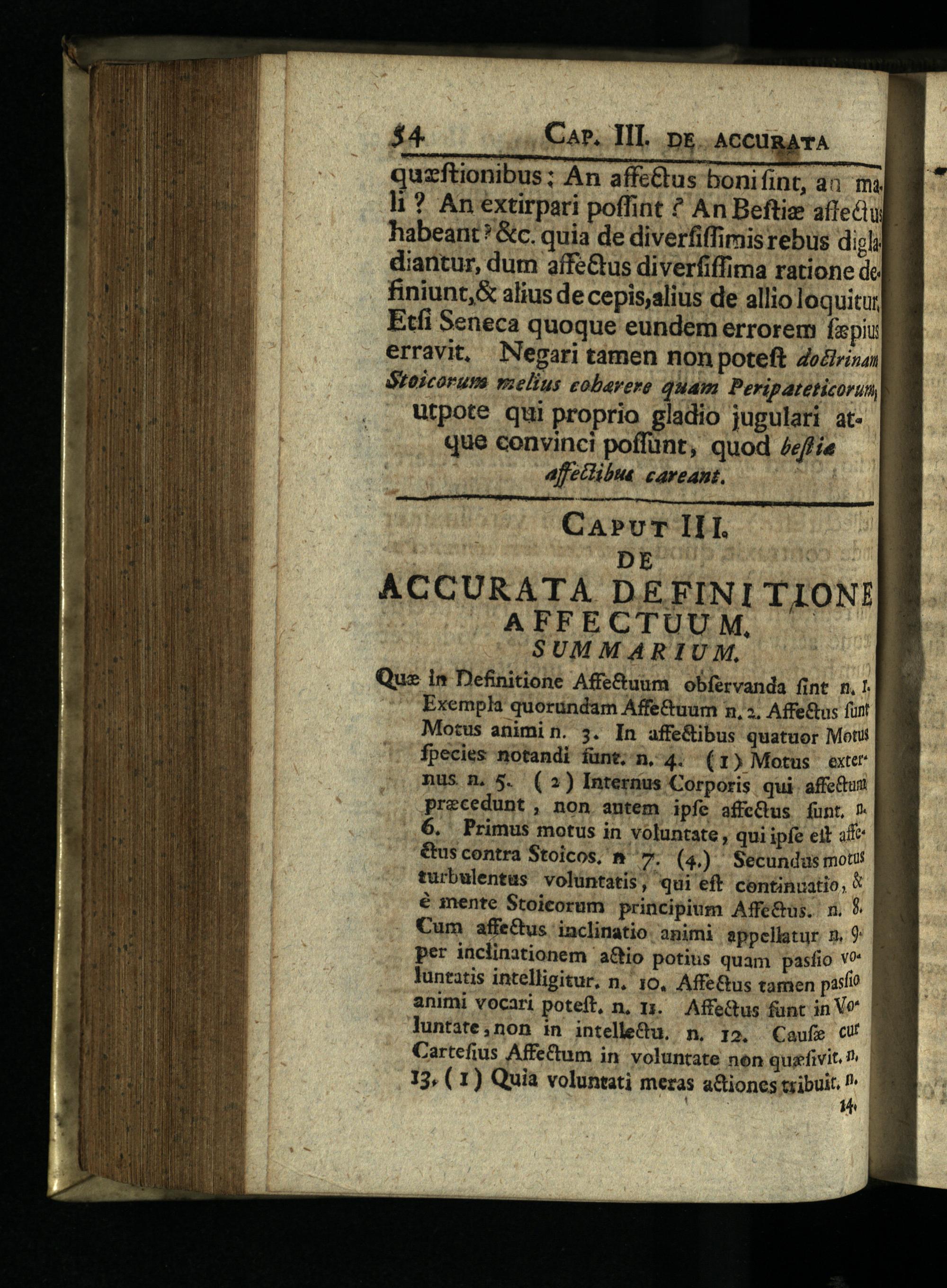 SUMMARIU XM,: Que i» Definitione Affe&uum obfervanda(int n. Exemph quorundam Affe&uum n, 3. Affe&us fo| Motus animin. 3. In affe&ibus quatuor Mot|. fpecies notandi funt. n. 4.(1) Motus exter p nus m. 5.(2) Internus Corporis. qui. affeui precedunt, non antem ipfe affeQus funt, 7 ,.6. Primus motus in voluntate, qui ipfe eit adc &us contra Stoicos, n T.(4). Secundus moti turbulentus. volüntatis, qui eft centinuatio,* € mente Stoicorum principium Affe&us. n.* Cum affectus inclinatio animi appelletur 5. 9 per inclinationem a&io potitis quam pasfio vo lüntatis intélligitur, n,' 10, Affe&us tamen pasfio animi vocari poteft, n, rj. AffeQtus funt in V* luntate,non in intelleQu. n, 12. Caufe c| Cartefius Affetum in voluntate non quzfivit.?|