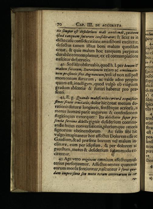 42. E. g. Quando malefcurin torturd exquifrir« Jfmes entis eruciatás, dolor hic Creat metum du rationis futurz longioris, fen füsque acrioris, is metus homini parit angorem& cenfesfionem flagitiogam extorquet: lta Je/edario fuper praJéntia femine dilettegignit defiderium continu ande hujus converfationis,pluriumque amoris fignorum obtinendorum. Ac falfo fibi hic vulgo imaginantur hos affe&us Dolorem effe ac Gaudium,&ad prefens borium vel malum inclinare, eum per idipfum,.& per dolorem ac gaudium, metus& defiderium lolummodo excitentur, e