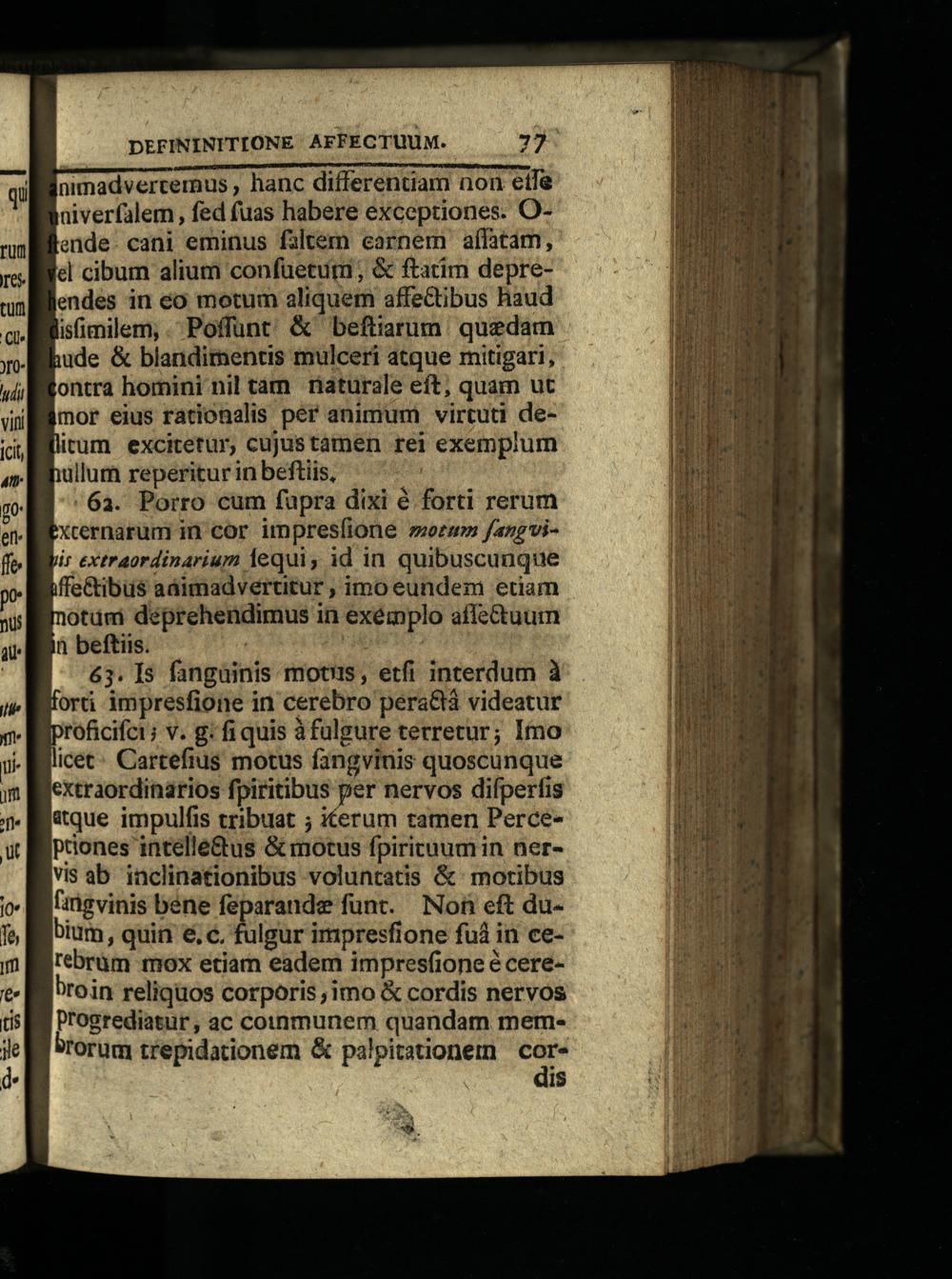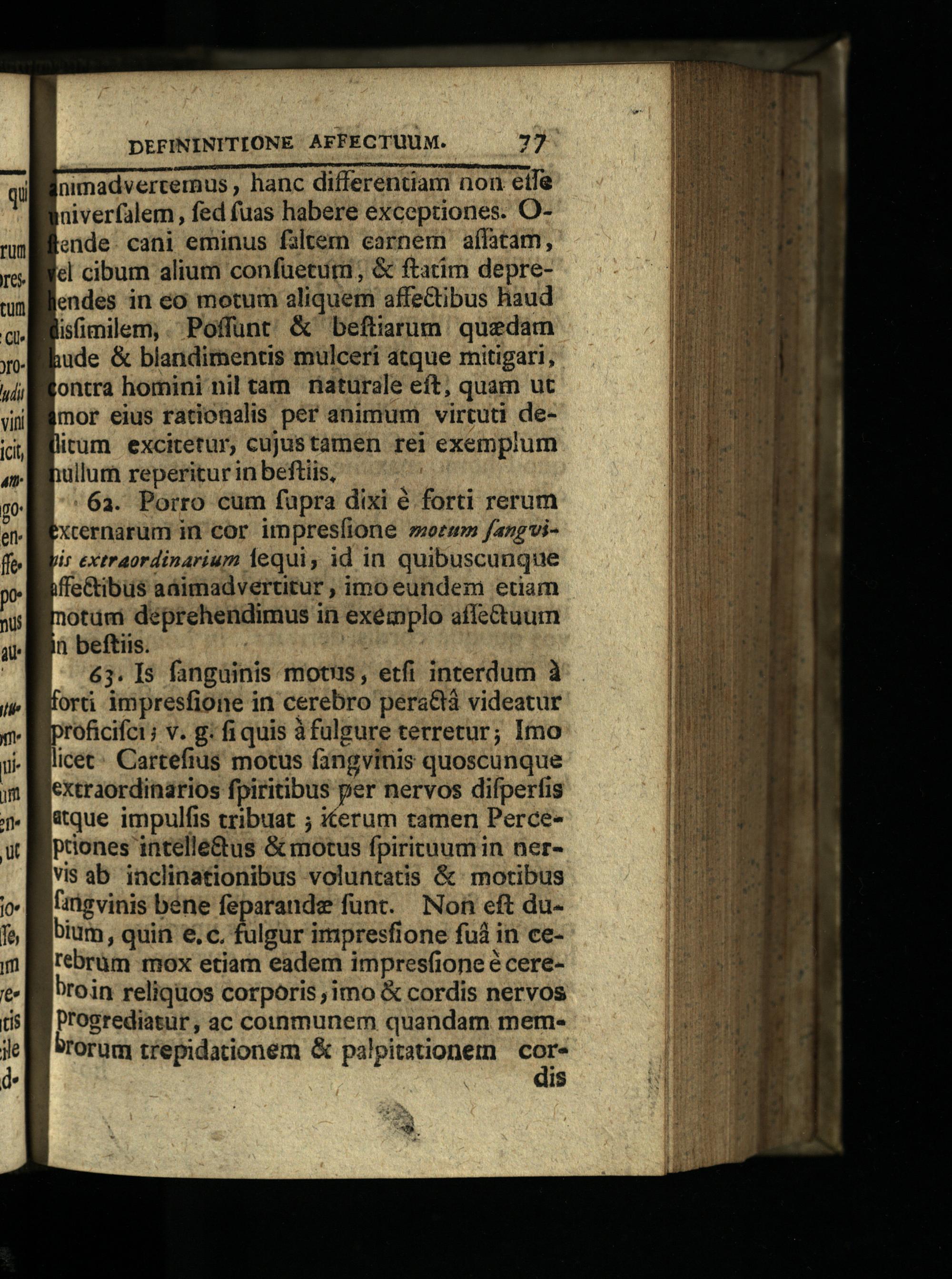 63. Is fanguinis motus, etfi interdum à forti impresfione in cerebro pera&à videatur proficifci; v. g:fiquis àfulgure terretur; Imo icet: Cartefius motus fangvinis quoscunque extraordinarios fpiritibus per nervos difperfis atque impulfis tribuat; iéerum tamen Perceptones intelle&us& motus fpirituum in nervisab inclinationibus voluntatis& motibus faigvinis bene feparande funt. Non eft dubium, quin e. c. fulgur impresfione fud in cerebrüm mox etiam eadem impresfione écerebroin reliquos corporis imo& cordis nervos Progrediatur, ac couumunem quandam membrorum trepidationem& palpitationem or