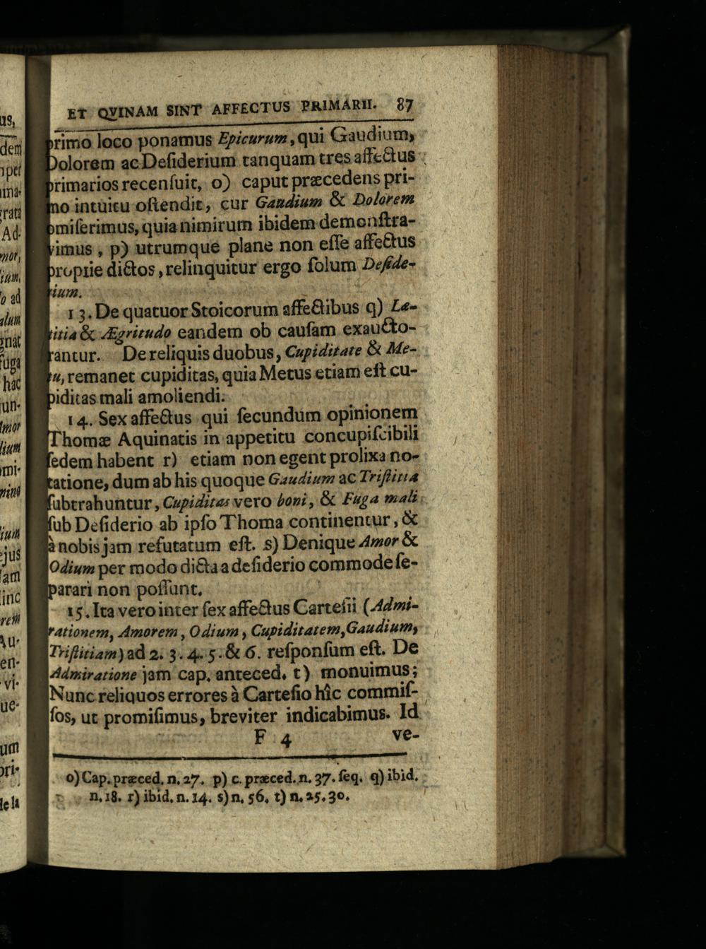 irimariosrecenfuit, o) caput praecedens prio intüicu oftendit, cur Gazdium& Dolorem bmiferimus, quia nimirum ibidem demonftraimus, p) utrumque plane non effe affe&tus broprie diétos, relinquitur ergo folum DefídeUT,: k 1 3. De quatuor Stoicorum affeGibus q) Zeitia& 4Egrirudo eandem ob caufam exauctoantur... Dereliquis duobus, Cupidizare& Me«remanet cupiditas, quia Metus etiam eft cubidicas mali amoliendi: t4. Sex affe&us qui fecundum opinionem homz Aquinatis in appetitu concupifcibili edem habent r) etiam non egent prolixa noatione, dum ab his quoque Gaium ac Triffiria