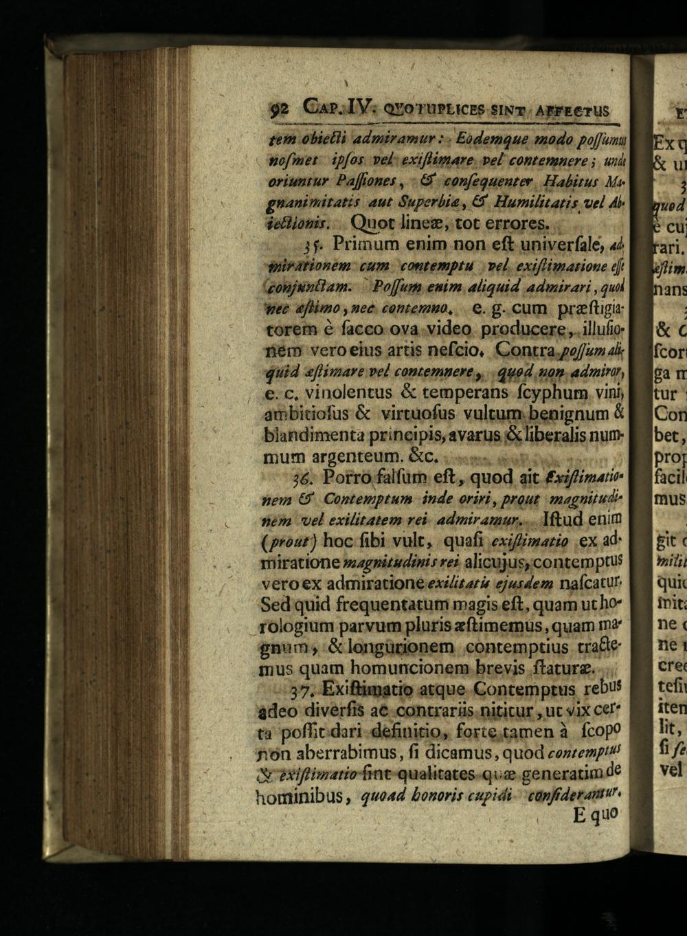 zem obietli admiramur:. Eodemque modo poffumu nofmet: ipfos vel exiflimare. vel contemnere;. uit oriuntur. Paffiones,- eonfeguenter, Habitus Me gnanimitatis aut Superbia,€9. Humilitatts uel Ak dellionis... Quot linez, tot errores.. 3f. Primum enim non eft univerfale, 4/ dnirationem: cum: contemptu. vel. exiflimarione ejt (gonjuntiam.— Poffum enim aliquid admirari, qud Wee aflimo, nec. cantemuo,..€. g. cum. prefugie torem é facco ova.video producere ,. illufiofém vero eius artis nefcio, Contra.zo//um 4l qui eflimare vel contemnere y,.. qued, nom. admini, e. c, vinolentus& temperans fcyphum. vini, ambitiofus& virtuofus vultum. benignum& blandimenta principis, avarus& liberalis num mum argenteum.&c, s pubes 4 3&. Porro falfurn eft, quod ait£xiffimari nem€ Contemptum inde oriri, prout. magnitud sm vel exilitatem rei. admiramur... Iftud enim (prout) hoc. fibi vult, quafi exifimazio ex ad miratione»eagnitudinis rei alicujus, contem ptus vero ex admiratione exzizari ejusdem naícatur: Sed quid frequentatum magis eft, quam ut ho rologium parvum pluris zftimemus, quam m gnom,&longürionem contemptius trade mus quam homuncionem. brevis ftaturz.... 37. Exiftimatio atque Contemptus rebus àdeo diverfis aC. contrarüs.nititur, ut vix cet ta poffic.dari-definitio, forte.tamen à. fcopo fon aberrabimus, fi dicamus, quod cosrempt!! Y CeIftimariofint-qualitates-qua generatim de| hominibus, quwe«d bonoris cupidi. capfideram'. V E quo|