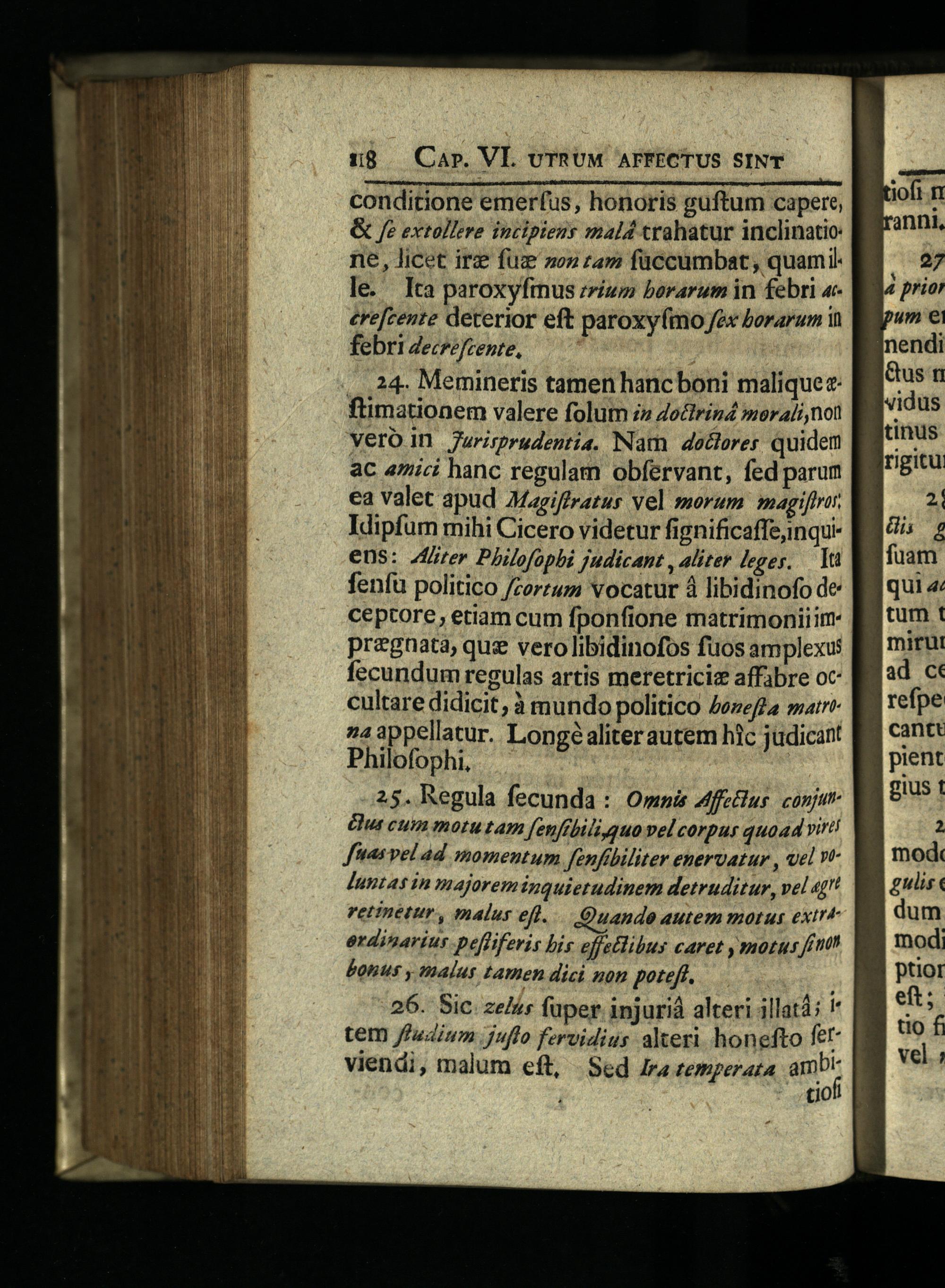 ...24. Memineris tamen hancboni maliquee ftimationem valere folum z» Zocirind morali, not vero im Jurisprudentia. Nam dolorer quidem ac azici hanc regulam obfervant, fed parum ea valet apud Magiffratur vel morum magiftri: Idipfum mihi Cicero videtur fignificaffe,inquiens: Zlirer Philofophi judicant, aliter leges,— Yi fenfu politico /zertum vocatur à libidinofo de ceptore, etiam cum fponfione matrimonii pregnata, que verolibidinofos fuos amplexus fecundum regulas artis meretriciz affabre oc cultare didicit, à mundo politico Zozefla mair* n4 appellatur. Longe aliter autem hic judicant Philofophi, -.45. Regula fecunda: Omnis Afecus conjutQui cum morutam fenfrbiliqquo vel corpur quaad virt J'uasvel ad momentum fenfibiliter enervatur, vel v luptas in majorem inquierudinem detruditur, vel f"! retinétur, malus eff. Quande autem matus extr erdinarius pefiferis bis effellibus caret motus fint Bonus y malus tamen dici non poteft., 26. Sic. zelr füper injuriá alteri illatá; tem f/udium juffo fervidius alteri honefto fet-| viendi, malum eft, Sed Ira zemperata ambr] , tio