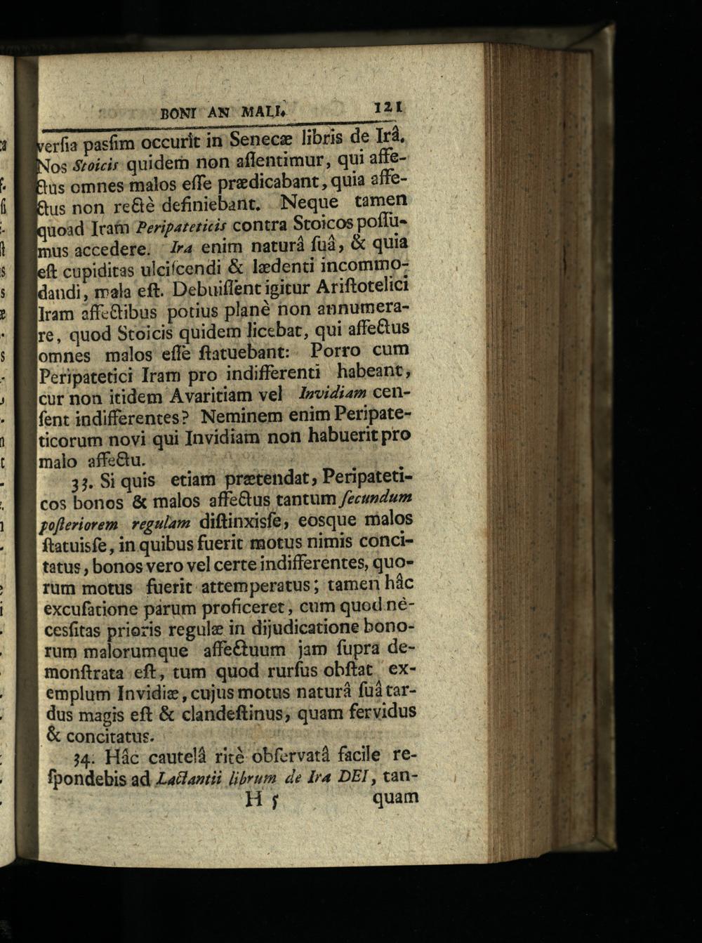 üs omnes malos effe praedicabant, quia affeQus non re&eé definiebant, Neque tamen quoad Ieafn Zeripateticit contra Stoicos poffumus accedere; r4 enim naturá fud,& quia eft cupiditas uleifcendi& ledenti incommo: dandi, mala eft. Debuiffent igitur Ariftotelici Iram offc&ibus potius plané non annumerare, quod Stoicis quidem licebat, qui affectus omnes malos effe flatuebant:« Porro cum Peripatetici Iram pro indifferenti habeant; cur non itidem Avaritiam vel l»vidiam cenfent indifferentes? Neminem enim Peripateticorum novi qui Invidia non habuerit pro malo affe&u.