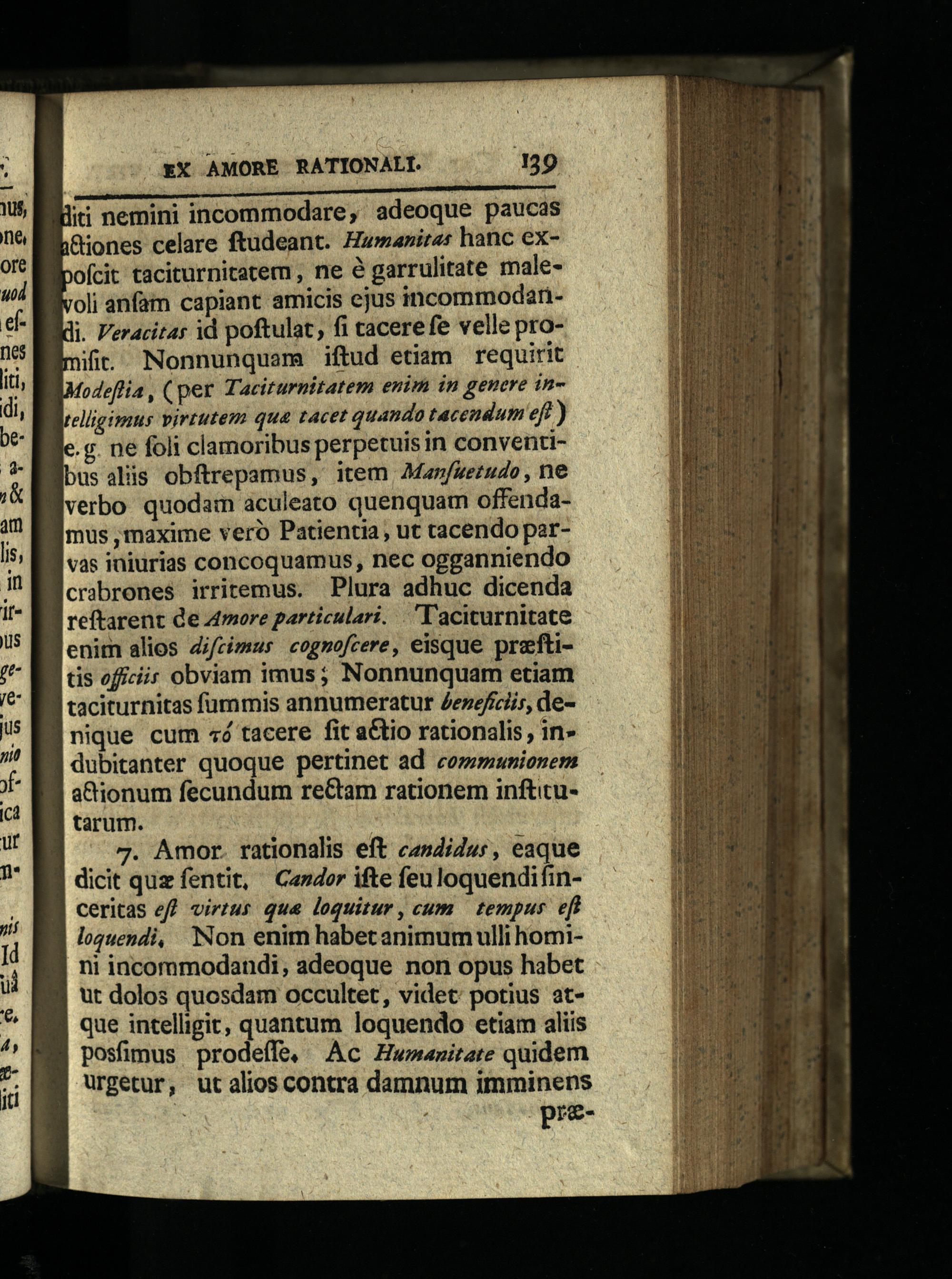 7. Amor. rationalis eft casdidu;, eaque dicit quz fentit, Cazdoer ifte feuloquendifinceritas eff virtus qua loquitur, cum| tempus. eft loquendi, Non enim habet animum lli homini incommodandi, adeoque non opus habet ut dolos quosdam occultet, videt potius atque intelligit, quantum loquendo etiam aliis posfimus prodeffe, Ac Humanitate quidem urgetur, ut alios contra damnum imminens