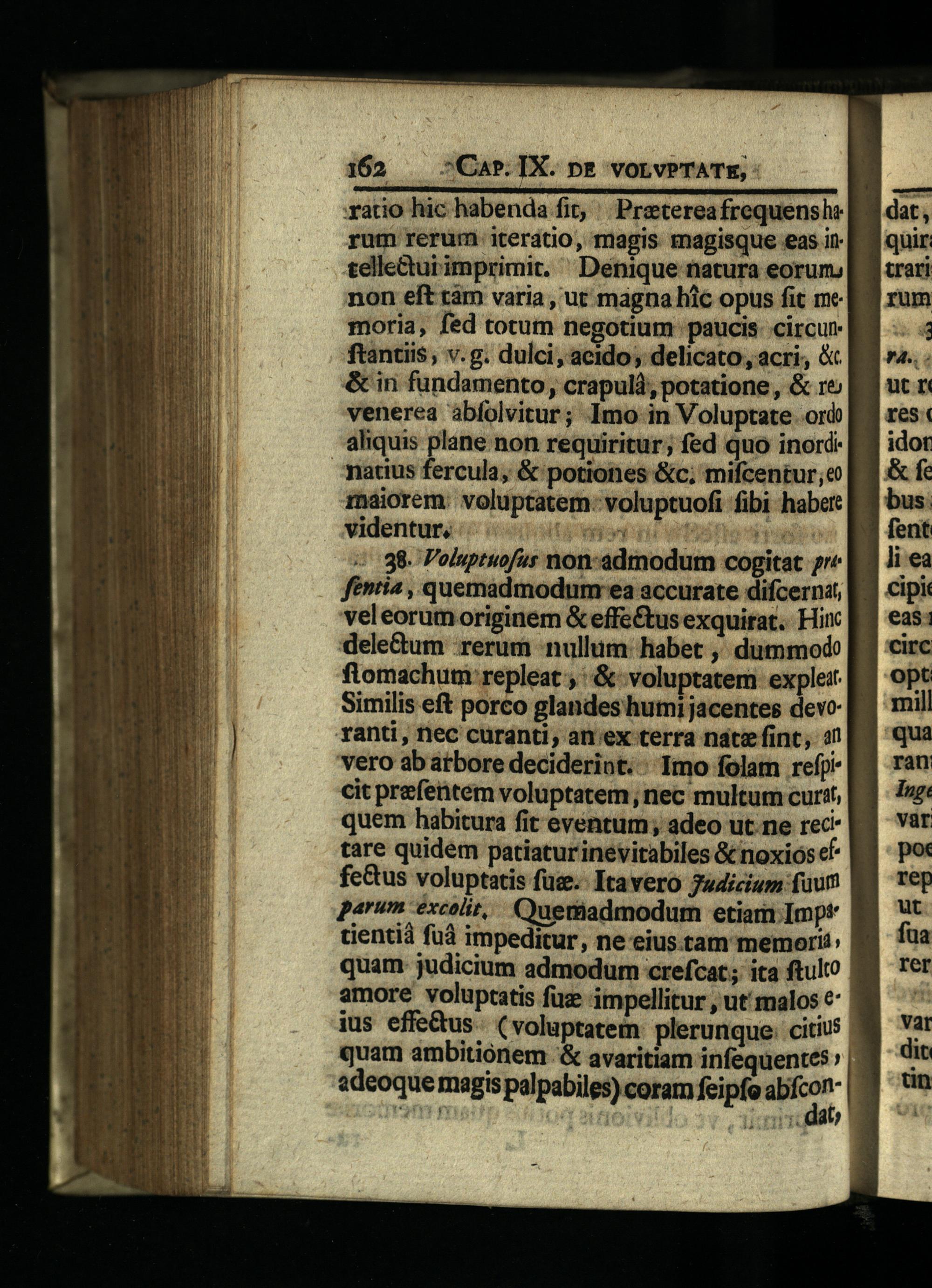 ratio hic habenda fit, Preterea frequenshe rum rerum iterátio, magis magisque eas in telle&ur imprimit,^ Denique natura eorum non eft tám varia, ut magna hic opus fit me moria, fed totum negotium paucis circunftantiis, v.g. dulci, acido; delicato, acri,& & in fündamento, crapulà, potatione,,& re» venerea àbfolvitur; Imo in Voluptate ord aliquis plane non requiritur; fed quo inord: matius fercula,& potiones&c; mifcentur;e maiorem: voluptatem: voluptuofi fibi haber: videntur, viti vit il »(98. Poluptuofus non-admodum cogitat 7r^ fenti«, quemadmodumrea accurate difcernat, veleorumoriginem& effe&us exquirat. Hinc dele&um rerum«nullum: habet ,' dummodo flomachum repleat;'& voluptatem explet Similis eft porco glandes humi jacentes devoanti, fiec curanti, an ex terra nátz fint, 2 vero ab atbore decideriot.' Imo folam refp. cit prefetem voluptatem, nec multum curi', E quem habitura fit eventum, adeo ut ne rec. E tare quidem patiaturinevitabiles& noxios e fe&us voluptatis fus. Itavero adicium fuum parum excolit, Cuemadmodum etiam Impt tientià fuà impeditur, ne eius tam memori!: quam judicium admodum crefcat;; ita ftulto| amore voluptatis fuz ámpellitur, ut' malos€'| ius effe&us.(voluptatem: plerunque. citius| quam ambitionem'& avaritiam infequentes»|: «deoque magis palpabiles eoram feipfo abfcon-:
