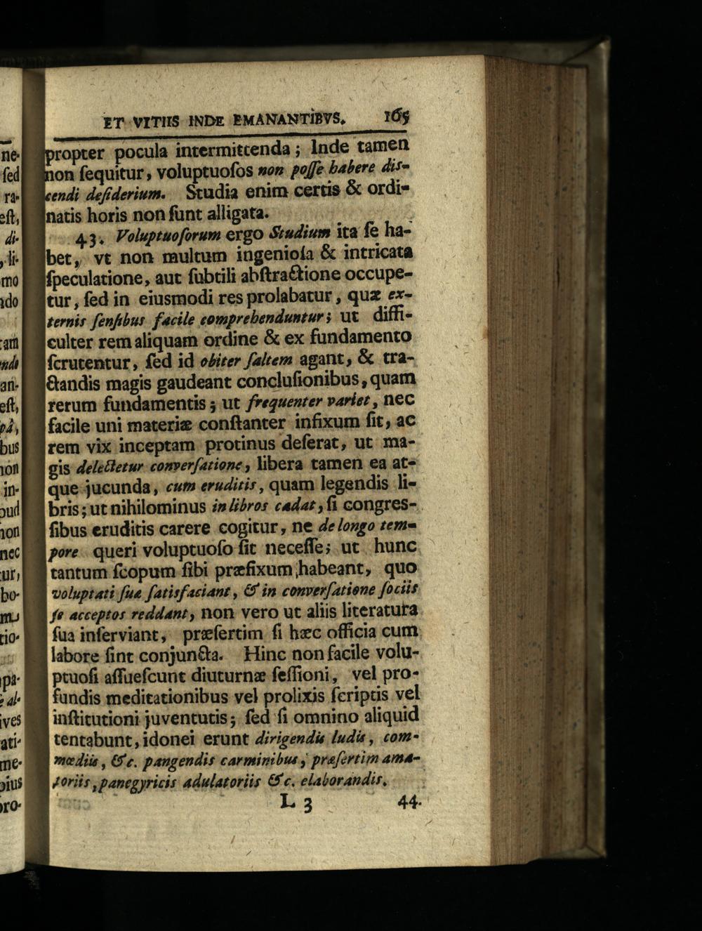 o3. Foluptuoforum ergo Studium ita fe habet, vt non multum ingeniola& intricata peculatione, auc fübcili abftra&ione occupetur, fed in eiusmodi res prolabatur, quz externis fenfbus. facile comprehenduntur ux. difficulter rem aliquam ordine& ex fundamento fcrutentur, fed id oZirer faltem agant,& tra&andis magis gaudeant conclufionibus, quam rerum fundamentis; ut frequenter varie:, neC facile uni materie conftanter infixum fit, ac rem vix inceptam protinus deferat, ut magis deledetur- comverfatione, libera tamen ea at* que jucunda, eut eruditis, quam legendis libris;ut nihilominus i»i/ros cadat, fi congres-. fibus eruditis carere cogitur, ne de longo teme pore queri voluptuofo fit. neceffe; ut. hunc. tantum fcopum fibi prefixum;habeant, quo voluptati fue fatisfaciant,& in comver[atione fociis. fe acceptos reddant, non vero ut aliis literatura fua inferviant, prefertim fi heec officia cum. labore fint conjun&a. Hinc non facile voluptuofi affuefcunc diuturnz feffioni, vel profundis meditationibus vel prolixis fcripus vel inftitutioni juventutis;. fed fi omnino aliquid tentabunt, idonei erunt 4irigendis ludi, commedii, e. pangendis carminibus y prafortim amaJoriis ,panegyricis adulatoriis& c. elaborandis, m L 35 44.
