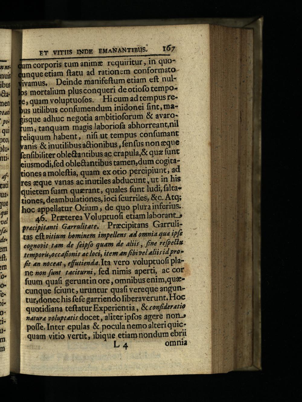 is cum anima requiritur, in quo-' nqueetiam ftatu ad rationem conformato:- Deinde manifeftum etiam eft nulbs mortalium plusconqueri deotiofo tempoe, quam voluptuofos. Hicum ad tempus rehus utilibus confumendum inidonei fint, mahisque adhuc negotia ambitioforum& avaro: gis laboriofa abhorreantnil nifi ut tempus confumant /anis& inutilibus aGtionibus ,fenfus non cque:' enfibiliter oble&antibus ac crapula,& quz funt| :iusmodi,fed oble&antibus tamen,dum cogitáiones a moleftia, quam ex otio percipiunt; ad res eque vanas ac inutiles abducunt ,ut in his quietem fuam qusgrant, quales funt ludi, faltationes, deambulationes, ioci fcurriles,&c. Atg; hoc appellatur Otium, de quo plura inferius. 46. Preterea Voluptuofi etiam laborant.» pracipitanti. Garrulitate, Precipitans Garrulitas eftvitium bominem impellens ad omnia qua ipfe cognovit. tam. de feipfo quam de aliis, fne refpetiu. temporisyoccafionis ac loci, item 4n frbivel alii sid pra» fit 4n noceat y effutienda.]ta vero voluptuofi plane son funt. taciturni, fed nimis aperti, ac COP fuum quafi geruntin ore ,omnibusenim,qug&e cunque fciunt, uruntur quafi vereque anguntur,donec his fefe garriendo liberaverunt, Hoc quotidiana teftatur Experientia,& eonfderario natura voluptatis docet, aliter ipfos agere non» poffe. Inter epulas& pocula nemo alteri quicquam vitio vertit, ibique etiam nondum ebrii : L4 omnia