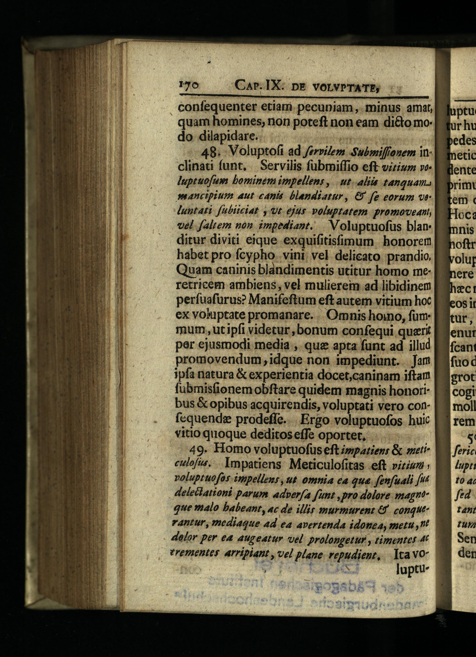 do dilapidare. e| 48. Voluptofi ad /errilem Submiffonem in: clinau funt, Servilis fübmiffio eft virium v luptuofum bominem impellens, ut..aliia tanquam. mancipium aut canis. blendiatur,€ fe eorum ve luntati fubitciat y Ut ejus voluptatem promoveant, vel faltem non impediant... Voluptuofus blan ditur diviti eique exquifitisimum| honorem habet pro fcypho. vini vel delicato prandio, Quam caninis blandimentis utitur homo meretricem ambiens, vel mulierem ad libidinem perfuafurus? Manifeftum eft autem vitium hoc ex voluptate promanare.. Omnis hoino, fum mum, utipfi videtur,bonum confequi querit per ejusmodi media, quz apta funt ad illud promovendum,idqüue non impediunt. Jam ipfa natura& experientia docet,caninam iftam fubmisfionemobftare quidem magnis honori- E bus& opibus acquirendis, voluptati vero con- P fequendz prodefle... Ergo voluptuofos huic E vitio quoque deditos effe oportet,; 49. Homo voluptuofus eft impatiens& meticulofis.. Impatiens: Meticulofitas eft vizizz: voluptuofos impellens,ut omnia ea qua. fenfuali[v deleclationi parum adper[a funt, pro dolore magntque malo babeant, ec de illir murmurenz€f. conqutrantur, mediaque ad ea avertenda idonea, metu,| dalor per ea augeatur vel. prolongetur, timentes 4 vrementes arripiant» Vel plane. repudient, ltavo- D V 1| MN T luptu- 1