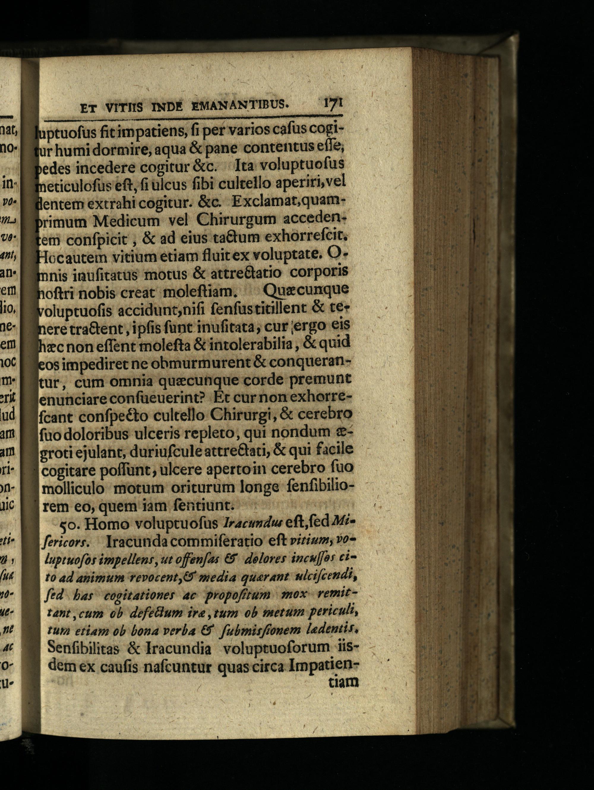 rem eo, quem iam fentiunt. i so. Homo voluptuofus Iracusdw eft, fed Mifericors. Iracunda commiferatio eft prism, vo luptuofos impellens, ut offenfas€. dolores incuffos eito ad animum vevocent,U media quarant: nicifcendi, fed. bas cogitationes 4c propofitum nox remittant ,cum ob defelum ire,tum ob metum periculi, tup etiam ob bona verba€ fubmisffonem ladentis, Senfibilitas& Iracundia voluptuoforum iisdem ex caufis nafcuntur quas circa Irnpatientiam