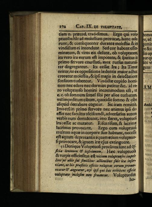 tiam n. priced, tradidimus,«. Ergo qui volu ptuofos hic ad moleftiam provocat, hunc ode runt;& confequenter durante moleftia& it vindi&amei intendunt. Sed cor habent effaminatum,& vires eis defünt, ob voluptatem ita vero ira eorum eft impotens,& fpiritus in primo fervore coarGlati, mox rurfus naturili ter disgregantur.[ta ceffat Ira; Ita Timor oritur,ne ex oppofitione ledentis maior adhuc creeetur moleftia,& ipfi magis in dele&atione fenfüumturbentur,| Vindi&z cupido horinem necedere nec dormire patitur&c. id ve ro voluptuofo homini. incommodum eft, ut €. c-ob fomnum femel fibi per alios turbatum, velimpeditum cibum, quotidie fomno& cibo aliquid detrahere cogatur. Siciram remittit. Imoetfiin primo fervore nec animus ipfi deeffet nec facultas ulcifcendi ,adverfarius autem verbiseum demulceret, itno fleret, voluptuof iraceffat ac mutatur. Rifüsrifum,& lacrimt lacrimas provocant, Ergo cum voluptuoli multum aquzin corpore fuo habeant, necefle eftaquam deprecantisaquam etiam voluptuofi provocare,& ignem ire ejus extinguere. «Denique Voluptuofi proclives funt. ad 0fficia lenonum 68 Liffrionum, Hec voluptuofi & turpis officiofitas eft virium voluptuofos impe!" Pens ut alii fui ffmilibur atlionibus fuis ita. infera viant, ut bir preflitis officiüs voluptas eorum promo" peatur 8 augeatur, etfi ipf qui bec exbibene offcia