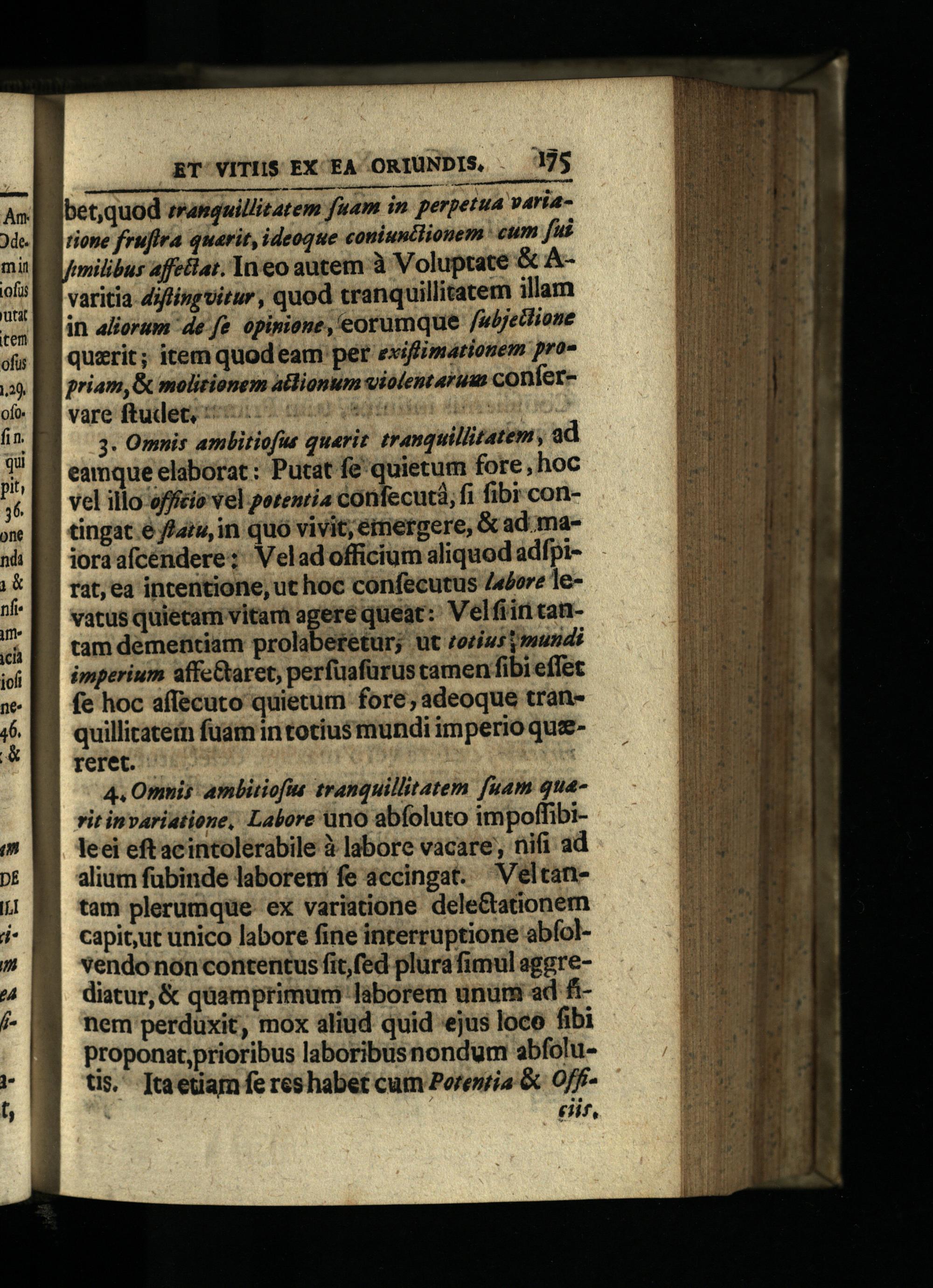 3. Omnis ambitiofue quarir. tranquillitatem, ad eamque elaborat: Putat fe quietum fore, hoc vel illo offíeio vel potentia CO ecuti, fi fibr contingat e 22i, in quo vivit; emergere,& ad. maioraafcendere:: Velad officium aliquod adfpirat,ea intentione, ut hoc confecutus Z4jore levatus quiecam vitam agere queat: Velfiiri tantam dementiam prolabetetur; ut roris mundi imperium affeCtaret, perfuafürus camen fibi effet fe hoc affecuto quietum fore; adeoque tranquillicatern fuam in totius mundi imperio quireret.^ Ue