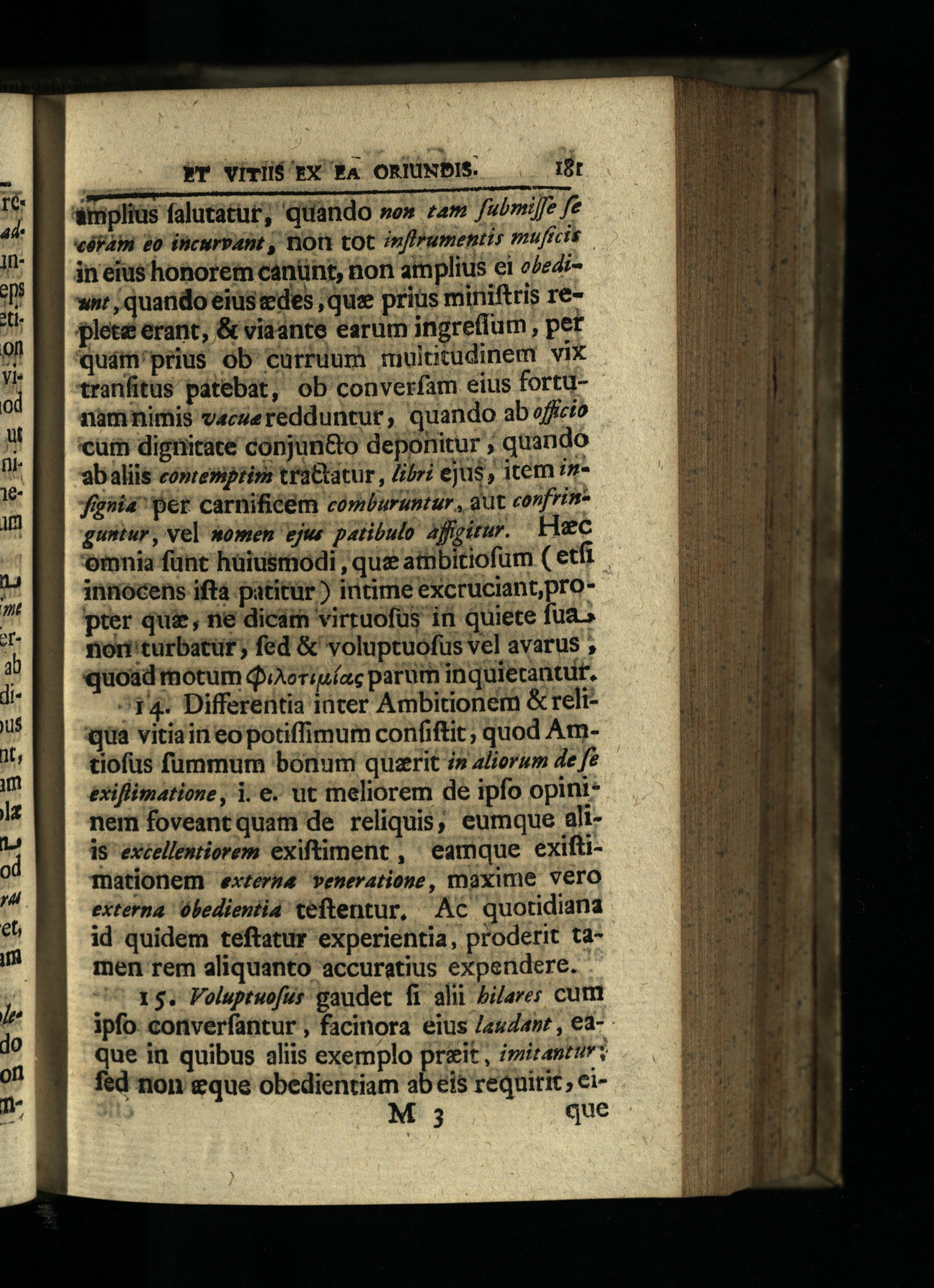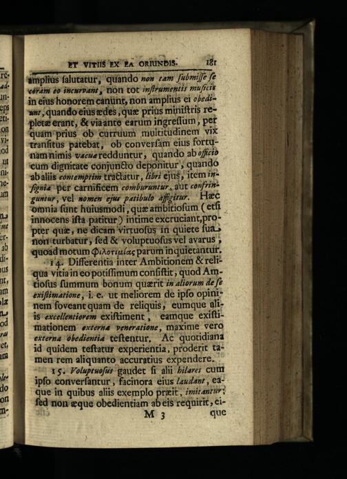 in'eiushonorem canünt, non amplius ei c/e4sn quando eius edes que priüs miniftris replete eranc,& viaante earum ingre(fum, pet quám'prius ob curruum multitudinem vix tranfitus pátebat, ob converfam eius fortusamnimis vacueredduntur, quando ab officio cuim dignitate conjün&o deponitur; quando abaliis co»resiprin trattatur, Zjri ejus, item?nfüsia' fer carnificem comburuntur., aut confringuntur, vel nomen ejus patibulo Affgirur. Flac omnia funt huiusmodi, que atibiiofum(etfi innocens ifta patitur) intime excruciant,propter quie, ne dicam virruofus ir quiete fua» rior'turbatur, fed& voluptuofus vel avarus, quoad totum doripíac parum inquiecantur. ^14. Differentia incer Ambirionem& reli«qua vitia in eopotiffimum confiftit; quod Amtiofus fummum bonum querit i» aliorum de fe exiflimatione, i.€. ut meliorem de ipfo opini* nem foveant quam de reliquis, eumque gliis excellentiorem exiftiment, eamque exiftiTüationem exéers4 veneratione, maxime vero externa obedientia teftentur, Ac quotidiana id quidem teftatur experientia, proderit ta