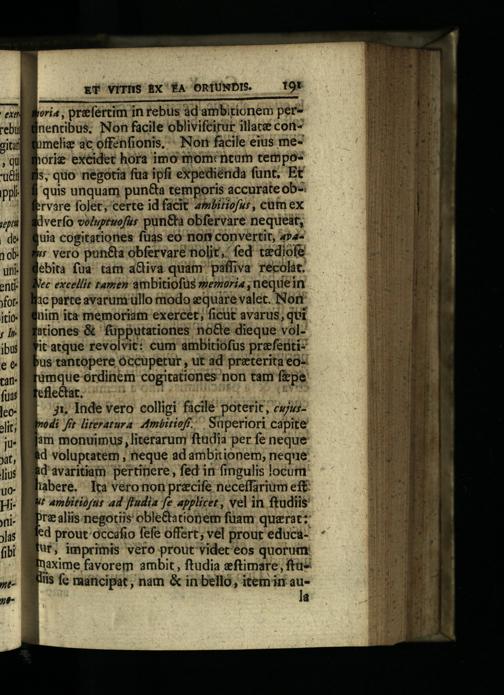 ébita füa' tam a&liva quam paffiva recolst. ec excellit tamen ambitiofüs memoria ,nequein Jic parce avarum üllo modo equare valec. Norm Enim ità memoriam exercet; ficut avarus, qui Üstiones&' füpputationes no&e dieque volitatque revolvit: cum ambitiofus prefeüti»us tantopere óccupetur, ut ad preterita eoümque-ordinem cogitationes non tam fpe 3 j. nde vero colligi facilé poterit, cusWiodi fit lireratura- Ambitioff.. Saperiori capite jam monuimus, literarum ftudia per fe neque d voluptatem, neque ad ambitionem, neque d'avaritiam pertinere, fed in fingulis locum abere. Tta veroton precife necelffarium eff