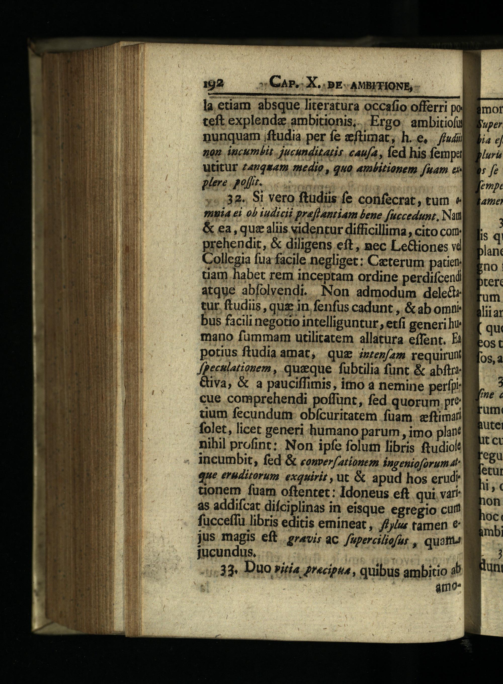 192.——«Cap. X. pr AMBVFIONE, la etiam absque literatura occafio offerri po teft explendz ambitionis. Ergo: ambitiofi nunquam iftudia. per fe eftimat, h.e... /(uii nou incumbit. jucunditatis caufa, led his femp« utitur z4vqsum medio, qua ambitianem fuam di »« 32. Si vero ftudiis fe confecrat, tum« muia ei ob iudicii preflantiam bene fuccedunr, Nu & ea, que aliis videntur difficillima, cito com: prehendit,& diligens eft, nec Le&tiones vd Collegia fua facile negliget: Caeterum patiet: tiam habet rem inceptam ordine perdiícend atque abfolvendi.. Non admodum dele tur. ftudiis, quz in. fenfus cadunt,& ab omn: bus facili negotio intelliguntur, etfi generi ht mano fummam utilitatem allatura effent. Ei potius ftudia amat, quz izzez/am requirunt Jpeculationem, quique fubtilia funt& abítrs Giva,& a pauciffimis, imo a nemine perfp: cue comprehendi poffunt, fed quorum.pre tium fecundum obfcuritatem fuam. eftimari folet, licet generi humano parum, imo plant nibil profint:. Non ipfe folum libris ftudiolt ; incumbit, fed& zomverfationem ingenioforumat que eruditorum exquirit, ut& apud hos erudi tionem fuam offentet: Idoneus eft qui vari as addifcat difciplinas in eisque egregio curd fucceffu libris editis emineat, fly tamen€ jus magis eft. gravis ac. /auperciliofur, quatis jucundus,"1 4,33. Duo siia recipe, quibus ambitio 5| : 2i amo« r