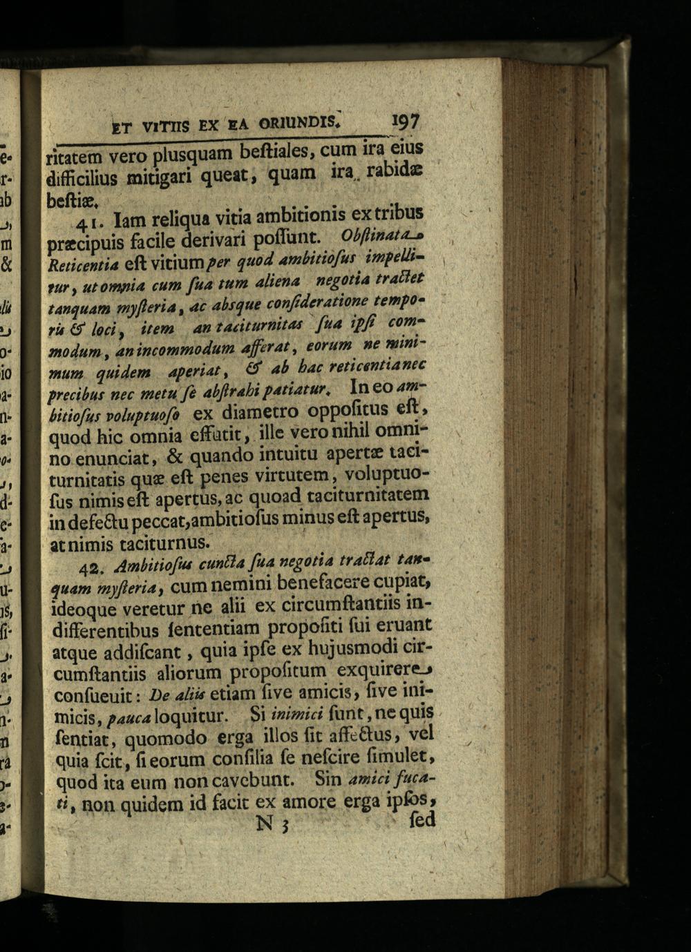 41. Tam reliqua vitia ambitionis ex tribus precipuis facile derivari poffunt. Ofinata.» Reticentia eft vitium ger quod ambitiofur impellisur, utompia cum fua tum aliena negotia tralet tanquam myfleria, ac absque confideratione tempo ra G lodi, item| an taciturnitas fua ipf commodum, anincommodum afferat, eorum we minimum quidem| aperiat,& 4b bac reticentianec precibus mec metu fà alfirabi patiatur, In eo 4bitiofus voluptuofa. ex diametro oppofitus eft, quod hic omnia effatit, ille vero nihil omnino enunciat,& quando intuitu aperte taciturnitatis que eft penes virtutem, voluptuofus nimis eft apertus, ac quoad taciturnitatem indefe&u peccat,ambitiofus minus eft apertus, at nimis taciturnus.