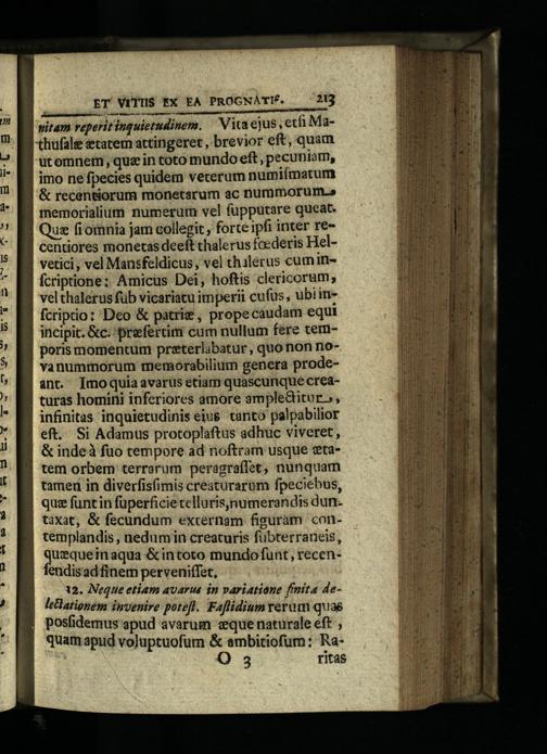 «thufalie etatem attingeret, brevior eft, quam utomnem, quz in toto mundo eft, pecuniam, imo ne fpecies quidem vecerum numiímatum & recentiorum monetarum ac nummorum.» memorialium numerum vel fupputare queat. Quz fiomnia jam collegit, forte ipfi inter recentiores monetas deeft thalerus foederis Helvetici, vel Mansfeldicus, vel thalerus cum mfcriptione: Amicus Dei, hoftis clericorum; vel thalerus füb vicariatu imperii cufus, ubiinfcriptio: Deo& patrie, propecaudam equi incipit.&c.'prefercim cum nullum fere temporis momentum preterlabatur, quo non novanummorum memorabilium genera prodeant. Imoquia avarus etiam quascunque creaturas homini inferiores amore amplectitur», infinitas inquietudinis eiue. tanto palpabilior eft. Si Adamus protoplaftus adhüc viveret, & indeà fuo tempore ad noftram usque vtatem orbem terrarum peragraífet, nunquam tamen in diverfisfimis creaturarum fpeciebus, que funtin fuperficie tellurisnumerandis duntaxat,& fecundum externam figuram contemplandis, nedum in creaturis fubterraneis, quzqueinaqua&intoto mundo funt, recenfendisad finem perveniffet,