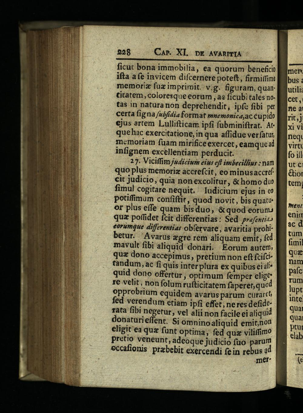 ficut bona immobilia, ea quorum beneficio ifta afe invicem difcernere poteft, firmitfim memoriz fuz imprimit. v.g. figuram, quan titatem,coloresque eorum, ae ficubi tales notas in naturanon deprehendit, ipfe fibi pet certa figna /v/fidia format mnemonica,ac Cupido ejus artem Lullifticam ipfi fabminiftrat. At quehac exercitatione, in qua affidue ver fatur memoriam fuam mirificeexercet, eamque infignem excellentiam perducit.