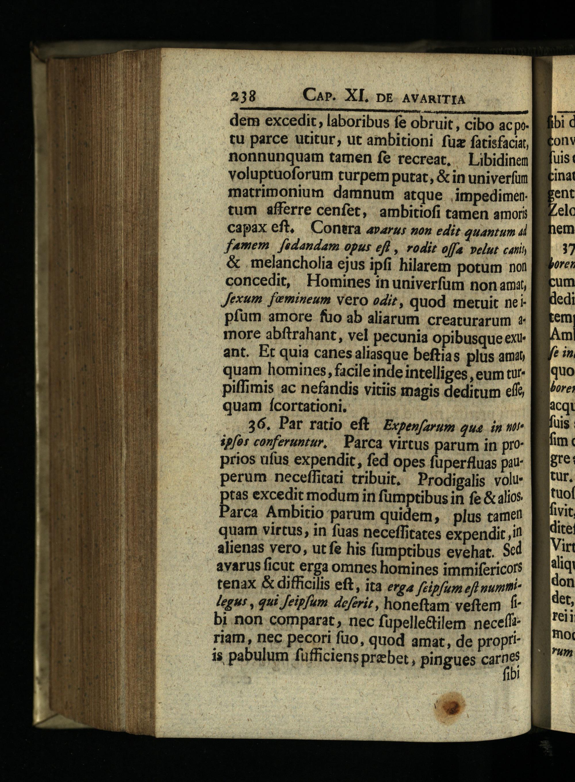 dem excedit, laboribus fe obruit, cibo acp». tu parce utitur, ut ambitioni füz fatisfacia, nonnunquam tamen fe recreat,—Libidinen voluptuoforum turpem putat,& in univerfum matrimonium damnum atque mpedimentum afferre cenfet, ambitiofi tamen amor capax eft, Contra avarus non edit quantum 4i famem. fadandam opus efl, rodir offa velut catis &.melancholia ejus ipfi hilarem potum noi concedit, Homines inuniverfüm non amit, Jexum femineum vero odi, quod. metuit ne. pfum amore füo ab aliarum creaturarum* more abítrahant, vel pecunia opibusque exant. Et quia canesaliasque beftias plus amt quam homines, facile inde intelliges, eum turpiffimis ac nefandis vitiis magis deditum cffe quam ícortationi.