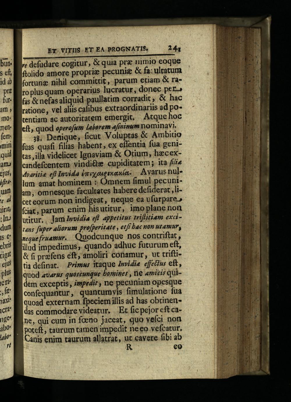 BENE adiutlnsi MM, E re defüdare cogitur,& quia pre nimio eoque flolido amore propriz pecunie& fa: ulatum fortunz. nihil committit, parum etiam& ratoplus quam operarius lucretur, donec per.» fas& nefas aliquid paullatim corradit,& hac ratione, vel aliis cafibus extraordinariis ad potentiam ac autorirarem emergit, Atquehoc eft, quod eperofum laborem afimimum nominavi. 3$. Denique, ficut Voluptas& Ambito fuss quafi filias habent; ex eflentia fua genitas illa videlicet lgnaviam& Otium, hzcexcandefcentem. vindi&e cupiditatem; ita f/i« dariti efl Invida émvyengsuanía. Avarus nullum amat hominem: Omnem fimul pecuniam, omnesque facultates habere defi erat ,liceteorum non indigeat, neque ea vfurpare., fiat, parum enim hisutitur, imo plane non utitur, Jamilevidie eff appetitus triflitiam excitans fuper aliorum pro[peritate, etf? bac non utamur, neque fruamur. Quodcunque nos contriftat, illud impedimus, quando adhuc futurum eft, & fi prafens eft, amoliri conamur, ut triftitia definat. Primus itaque Jpvidie effeiius eft, quod avarus quoscunque bomines, Qe amicis quidem exceptis, i»pediz, ne pecuniam ogesque confequantur, quantumvis fimulatione fua quoad externam. fpeciem illis ad has obtinendas commodare videatur, Ec fic pejor eft cane, qui cum in foeno jaceat, quo vefci non poteft, taurum tamen impedit neeo vefcatur. Canis enim taurum allatrat, ut cavere fibi ab R eo