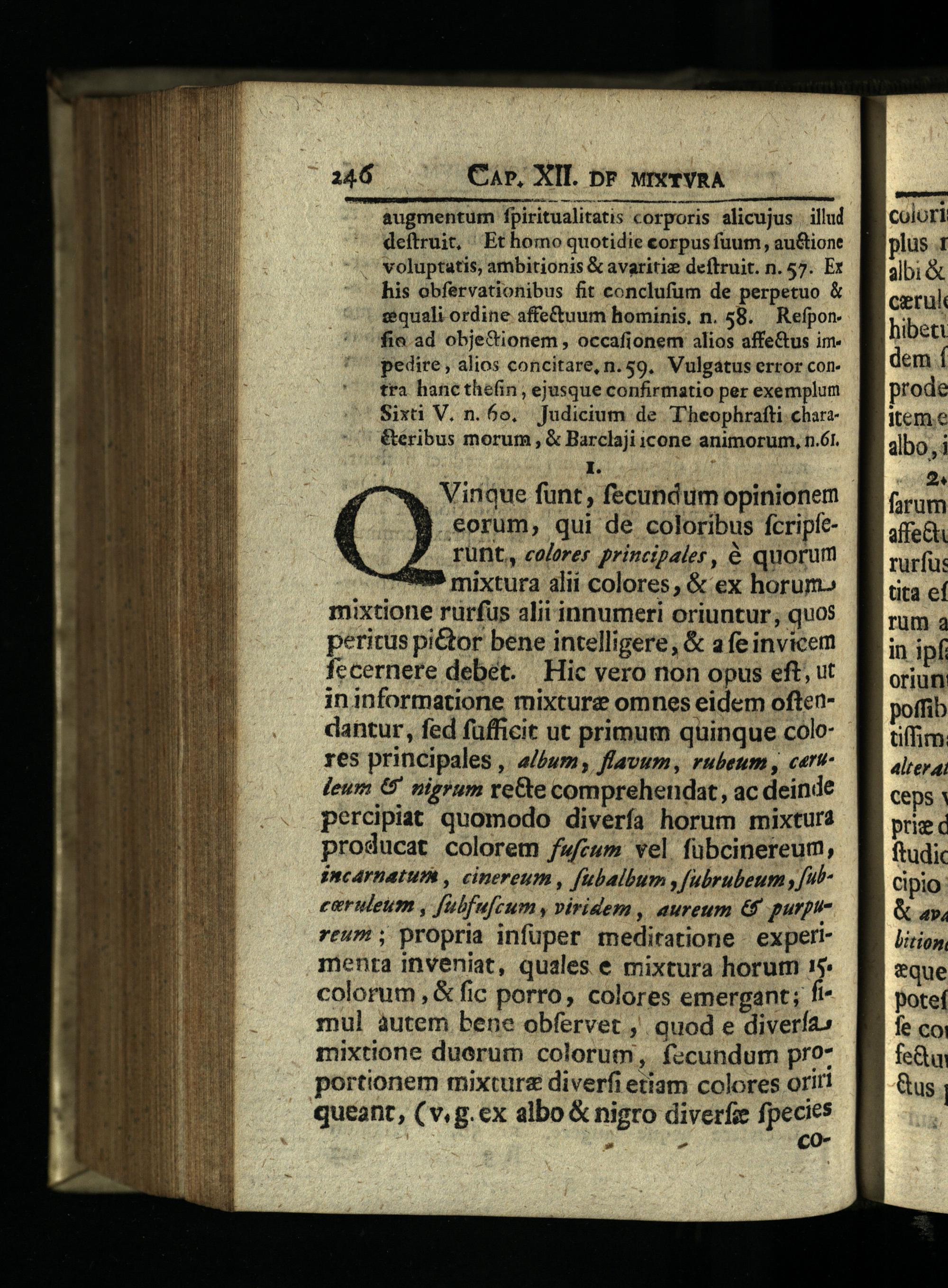 " 1. Virique funt, fecundum opinionem .eorum, qui de coloribus fcripferünt, co/erer principales,& quorum mixtura alii colores,& ex horum» mixtione rürfus alii innumeri oriuntur, quos peritus pi&tor bene intelligere,& afe invicem fecernere debet. Hic vero non opus eft, ut ininformatione mixture omnes eidem oftendantur, fed fufficit ut primum quinque colores principales, a//um; flavum, rubeum, carudeum 6 nigrum re&e comprehendat, ac deinde percipiat quomodo diverfa horum mixtura producat colorem fw/cum vel fübcinereum, incArYhAIUP, cinereum, fubalbum, Jubrubeutn Jubceruleum, fubfufcum, viridem, aureum& perpe reum; propria infuper mediratione| experimenta inveniat, quales e mixtura horum 15 colorum,& fic porro, colores emergánt; f mul autem bene obfervet ,. quod e divería: mixtione duerum colorum, fecundum proportionem mixture diverfi etiam colores oriri queant,(v, g.cx albo& nigro diverfi fpecies »» co