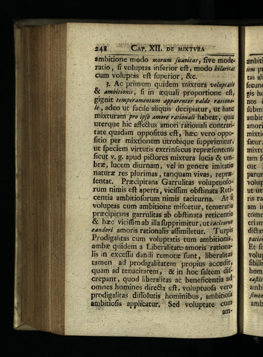 ?. Ac primum quidem mixtura volgpiarit & ambirionis, fi in equali proportione eft, gIgnit Zemperamentum appaventer valde. vationa/e, adeo ut facile aliquis. decipiatur, üt hanc mixturatmi 7o ipfo amore rationali habeat, quii uterque hic affe&us amori rationali contratitate quadam oppofitus eft,"hec. vero oppo fiio per mixtionem utrobique fupprimitur, ut fpeciem virtutis extrinfecus reprefentent ficut v, g. apud pictores mixtura lucis& umbre, lucem diurnam, vel in genere imitatio natürz res plurimas, tanquam vivas, repralentat, Precipiràns Garrulitas volupruolo: rum nimis eft aperta, viciffim obftinats Ret centia ambitioforum nimis taciturna. At voluptás cum ambitione mifcetur, temerarii precipitans garrulitas ab obftinata reticentit & hzc viciffim ab illa füpprimitur ,utzacizurm eendori amoris rationalis-a(fimiletur."urpis Prodigalitas cum voluptatis tum ambitionis; ambe quidem a Liberalitate: amoris rationalis in exceffu dandi remotz funt, liberalitas umen ad prodigalitatem propius accedit, quam ad tenacitarem,& in hoc faltem dif crepant, quod liberalitas ac beneficentia 4 omnes homines dire&a eft; voluptuofa vero prodigalitas diffolutis: hominibus, arribitiof? ambitiofis applicatur,' Sed. voluptate cum