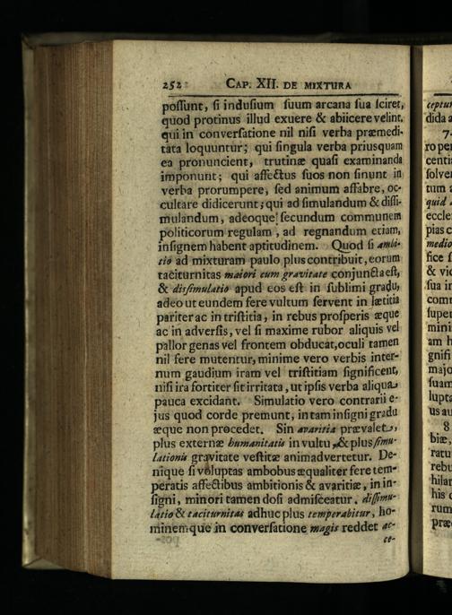 pln MM caus oho decim tnde cci NR poffunt, fi indufium. fuum arcana fua Íciret, quod protinus illud exuere& abicere velint, quiin converfatione nil nifi verba premeditata loquuntur; qui fingula verba priusquam ea pronuncient, trutine quafi exarminandi imponunt; qui affeétus fuos non finunt it verba prorumpere; fed animum affabre, oc cultare didicerunt; qui ad fimulaódum& diffi mulandum, adeoque; fecundum communem politicorum regulam, ad regnandum eciam, infignem habent aptitudinem.: Quod f en £ió ad mixturam paulo plus contribuit, eorum tacitarnitas maiori eum gravitate conjunta eft, & disfmulatio: apud cos eft in. fublimi gradu adeo uteundem fere vultum fervent in letitia pariterac in triftitia, in rebus profperis eque ac in adverfis, vel fi maxime rubor aliquis ve pillor genas vel frontem obducat,oculi ramen nil fere mutentur, minime vero verbis intérnum gaudium iram vel triftitiam fignificent nifi ira fortiter fitirritata, ut ipfis verba aliqua» pauca excidant,'Simulatio vero contrarii e jus quod corde premunt, intam infigni gradu eque nonprocedet. Sin avaritia prevalet.» plus externe Jumanitatis in vultu j& plus/fmlationis gravitate veftite animadvertetur. De nique fi vóluptas ambobus zqualiter fere tem" peratis affe&ibus ambitionis& avaritiz, in in figni, minori tamen dofi admifeeatur, Z/f/»latio& raciturnitas adhuc plus remperabitur, ho*