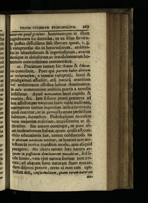 2. Plurimum tamen hic'srarur&&Zucatio contribuit, Puer qui parem babet divitem ac voluptuefum, a teneris voluptati, luxui& prodigalitati affüefcic, etfi naturd. avaritiam vel ambitionem affz&us habeat dominantes. In ala communiter ambitio pueris a tenellis B infüllatur. Apud mercarores lucri cupido.& avariia,&c.]am fiforre pueri preterea ad hos affe&tus per naturam fuam valde inclinant, corruptum eorum ingenium inde ajuventute quafi nutritur ,ut in prove&la etate perfectum habitum, fecunduin| Philofophiam moralem. vero majorem miferiam, acquifiverint ac didicerint. Sin: autem contingat, ut puer aliam inclinationem habeat, quam qualis eft conditio educationis fuz, tamen confuetudo ita in alterum naturam vertitur, ut homini non moleftum fit in eius cupidinis modo, apte aliquid peragere; Nec altera tamen hzc natura 1quam in pa[[onem dominanem mutabitur, fed facile. homo, vera ejus natura fortiter nonirriUta, ad alteram hanc naturam füam mutandam difponi poterit, certe ei non tam opeTofüm erit, cen/uetmdinem, quam veram naturam
