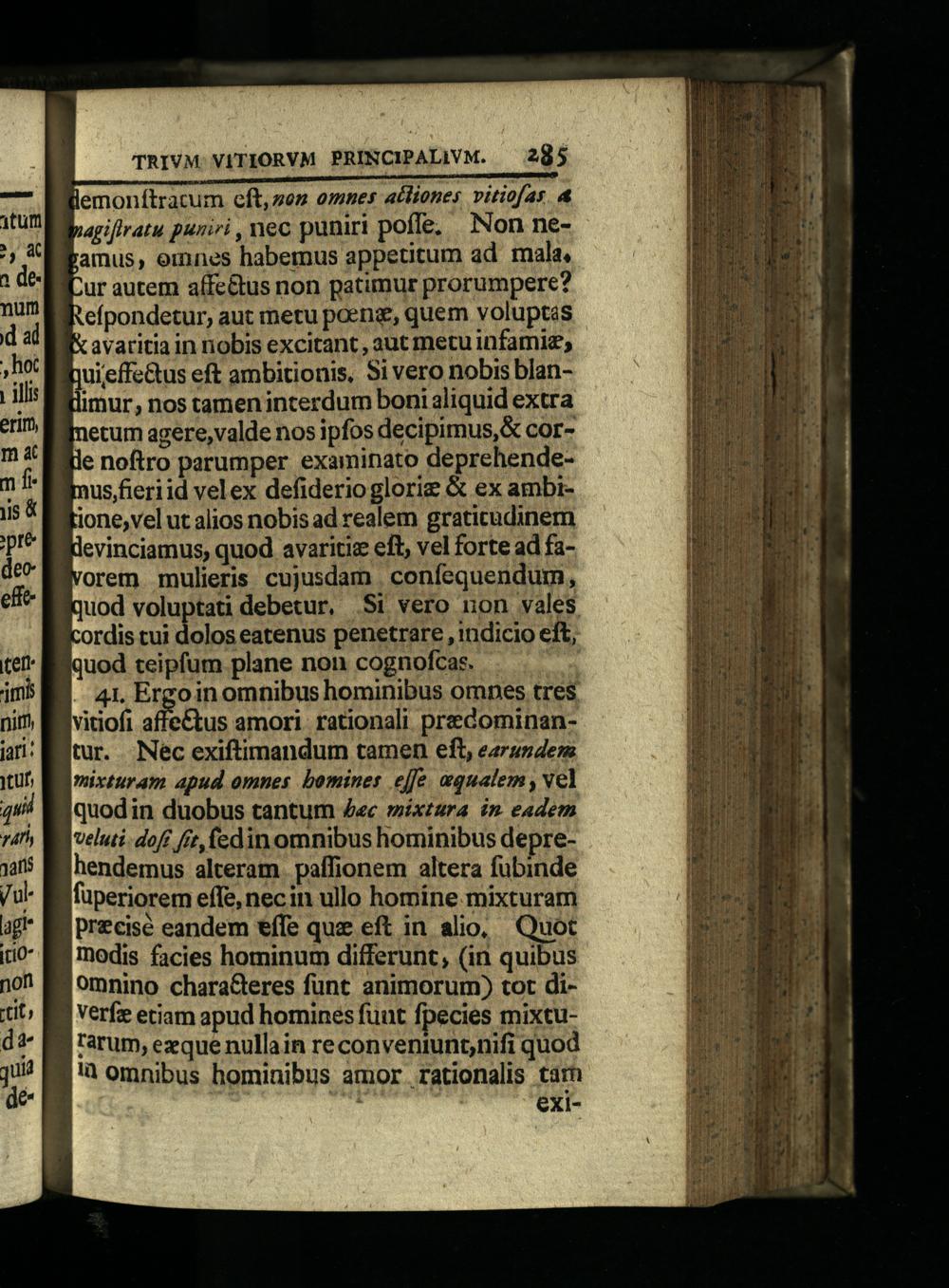 & avaritia in nobis excitant, aut metu infami, Quieffe&tus eft ambitionis, Si vero nobis blanlimur, nos tamen interdum boni aliquid extra etum agere,valde nos ipfos decipimus,& corle noftro parumper examinato deprehendeusfieriid velex defiderioglorie& ex ambiione, vel ut alios nobis ad realem graticudinem devinciamus, quod avaritiz eft, vel forte ad faorem mulieris cujusdam. confequendurm, quod voluptati debetur, Si vero non vales ordis cui dolos eatenus penetrare, indicio eft, quod teipfum plane non cognofcas. 41. Ergo in omnibus hominibus omnes tres vitiofi affe&us amori rationali predominantur. Nec exiftimandum tamen eft, earundem mixturam apud omnes. bomines effe. aequalem, vel quodin duobus tantum«c mixtura i» eadem veluti. doft fit, fedin omnibus hominibus deprehendemus alteram. paffionem altera fubinde fuperiorem effe, necin ullo homine mixturam precisé eandem effe que eft in alio, Quot modis facies hominum differunt,(in quibus omnino characteres funt animorum) tot diVerfz etiam apud homines fuut fpecies mixturarum, ezque nullain reconveniunt,nifi quod là omnibus hominibus amor rationalis tarn ; exi