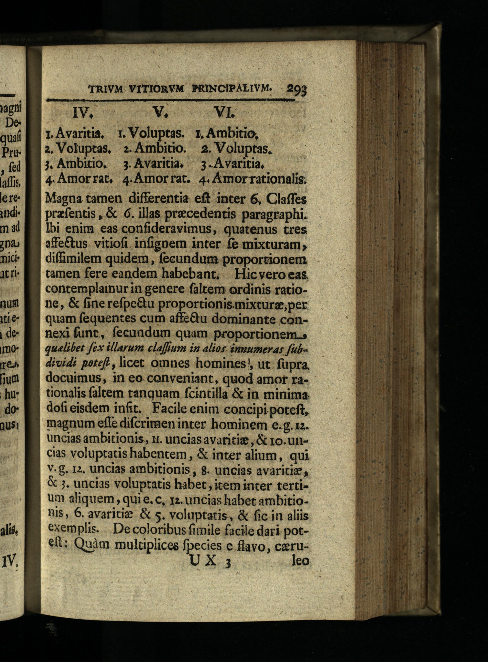 Magna tamen differentia eft inter 6, Claffes przfentis,& 6. illas precedentis paragraphi. Ibi enim eas confideravimus, quatenus tres affe&us vitiofi. infignem inter fe mixcuram, diffimilem quidem, fecundum proportionem tamen fere eandem habebant, Hicvero eas. contemplainur in genere faltem ordinis ratione,& fine refpc&u proportionis. mixture,;per quam fequentes cum affe&u dominante connexi funt, fecundum quam proportionem. qualibet fex illarum claffum in alios inmumeras fubdividi potef?, licet omnes homines! ut. fupra. docuimus, in eo. conveniant, quod amor ra-* tionalis faltem tanquam fcintilla& in minima. dofieisdem infit, Facile enim concipi poteft, magnum effe difcrimen inter hominem e.g. 12. uncias ambitionis, ru. uncias avaritig ,& 10. uncias voluptatis habentem,& inter alium, qui V.g. 12, uncias ambitionis, 8. uncias avariti,: & j. uncias voluptatis habet, item inter tertium aliquem, qui e.c, 12. uncias habet ambitionis, 6. avaritie& s. voluptatis,& fic in aliis exemplis... De coloribus fimile facile dari poteft: Quim multiplices fpecies e.flavo, ceruX.3 leo