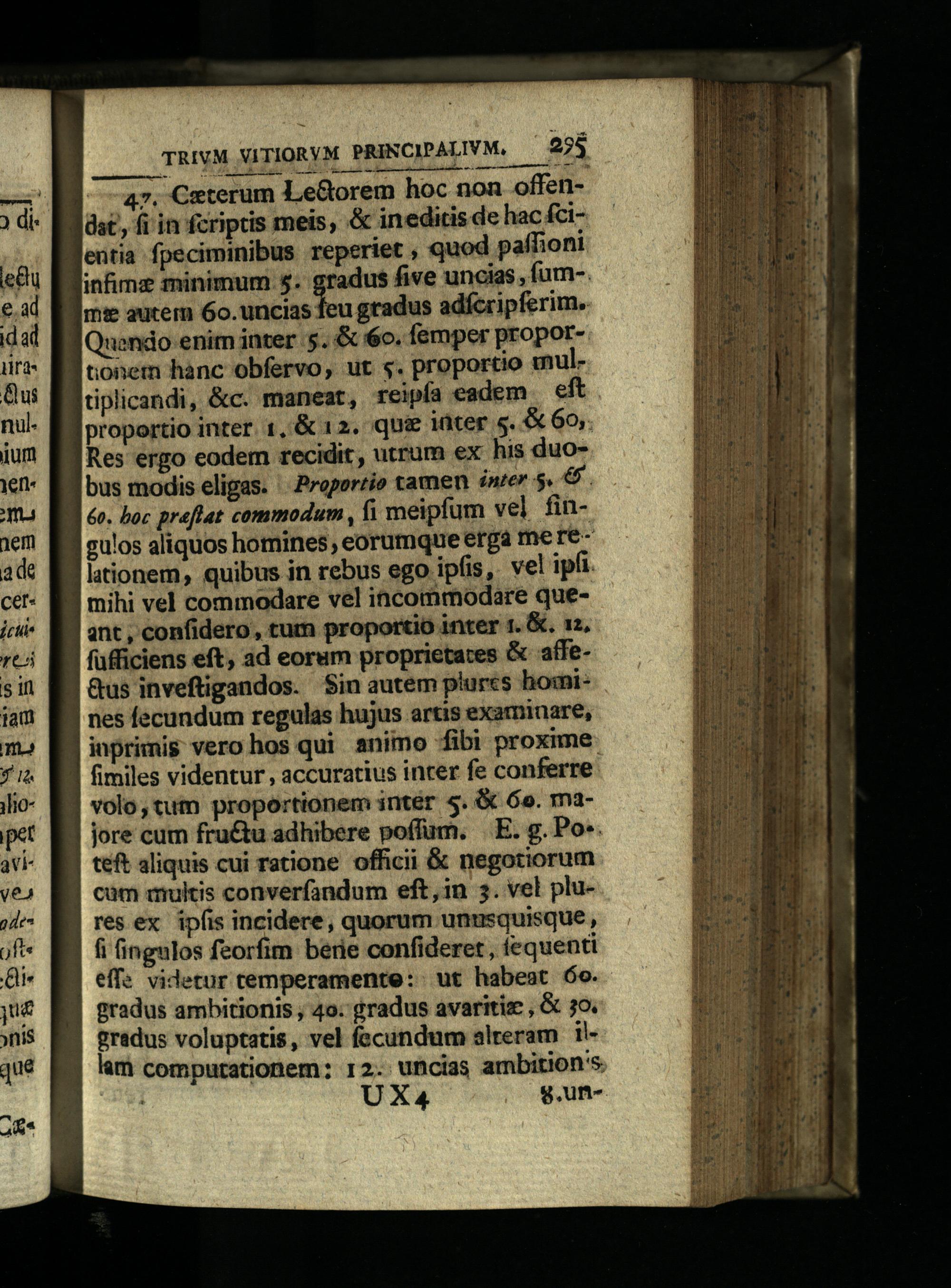 47. Ceterum LeGorem hoc non offenüst, fi in fcriptis meis,& ineditis de hac fcientia fpeciminibus reperiet, quod paffioni infimz minimum$4. gradus five uncias, fum-. mie autem 60.uncias feu gradus adferipferim. Quendo enim inter 5.& 6o. femper proporB conem hanc obfervo, ut s. proportio wnultiplicandi,&c. maneat, reipía eadem eft proportio inter. 1,& 12. qu& iüter 5.& 60, Res ergo eodem recidit, utrum ex his duobus modis eligas.' Propertio tamen inrer$.&. éo. boc preflat commodum, fi meipfum vel fingulos aliquos homines, eorumque erga me relationem, quibus in rebus ego ipfis, vel ipfi. mihi vel commodare vel iacommodare queant, confidero, turn proportio inter 1.&. 12, füfficiens eft, ad eorum proprietates& affeQus inveftigandos. Sin autem plurcs hosines fecundum regulas hujus artis examinare, inprimis vero hos qui animo fibi proxime fimiles videntur, accuratius inter fe conferre volo, tum proportionem intér 5.& 6o. majore cum fruétu adhibere poffum. E. g. Po». teft aliquis cui ratione officii& negotiorum cüm multis converfandum eft,in 3. vel plures ex ipfis incidere, quorum unusquisque, fi ingulos feorfim berie confideret, equenti eff: videtur temperamente: ut habeat 6o. gradus ambitionis, 4o. gradus avaritiz,& 30. gradus voluptatis, vel fecundum alreram illam compurationem: 12. uncias ambition's UXA4 g.un